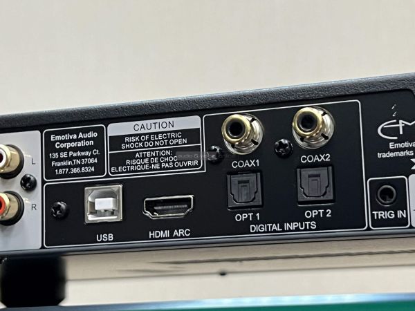 Nem a hangzáshoz volt köze, de a HDMI ARC remek titkos fegyver, ami sok hagyományos, kétcsatornás DAC-ból ma még hiányzik. Hasonló kényelmet eredményezett, mint egy házimozi erősítő. ARC-s tv távirányítójával vezéreltük az Emotiva jelszintjét és ha kikapcsoltuk a képmegjelenítőt, akkor a DAC is készenléti módba lépett (beleértve a trigger kábellel hozzáillesztett erősítőt). A procedúra visszafelé nem működött (bekapcsolni csak trigger jellel, vagy a saját távvezérlőjével volt hajlandó), de hálával gondoltunk a kreatív fejlesztőkre.