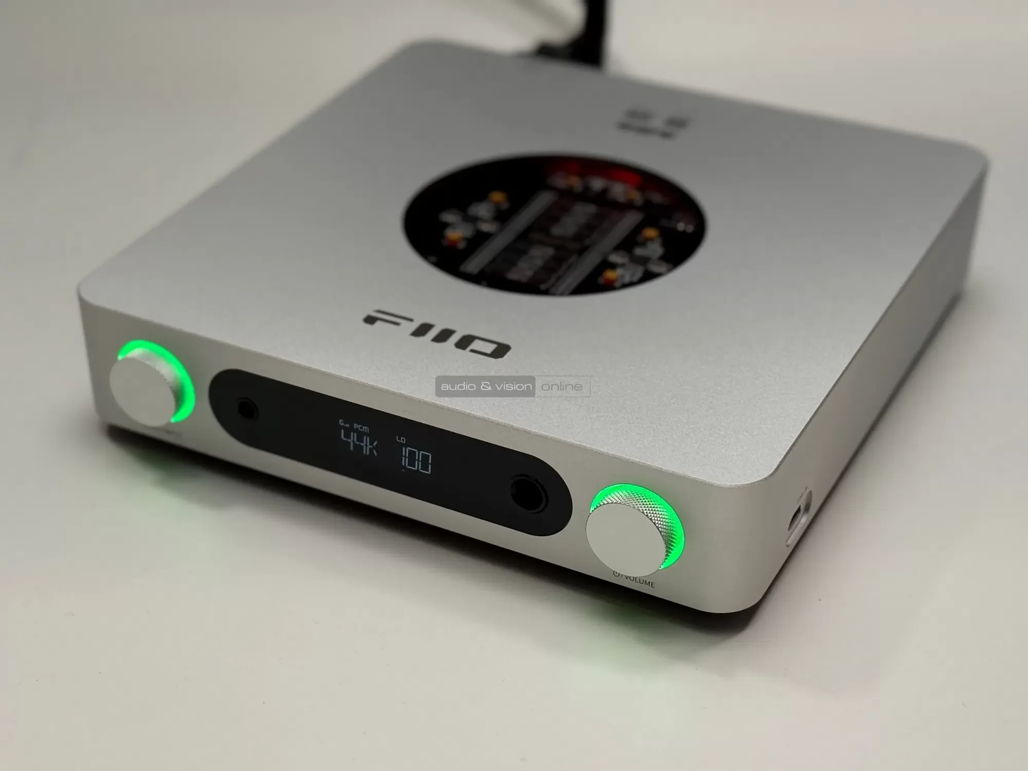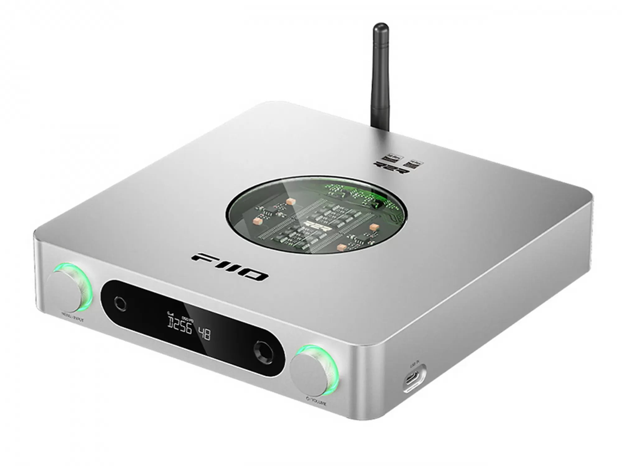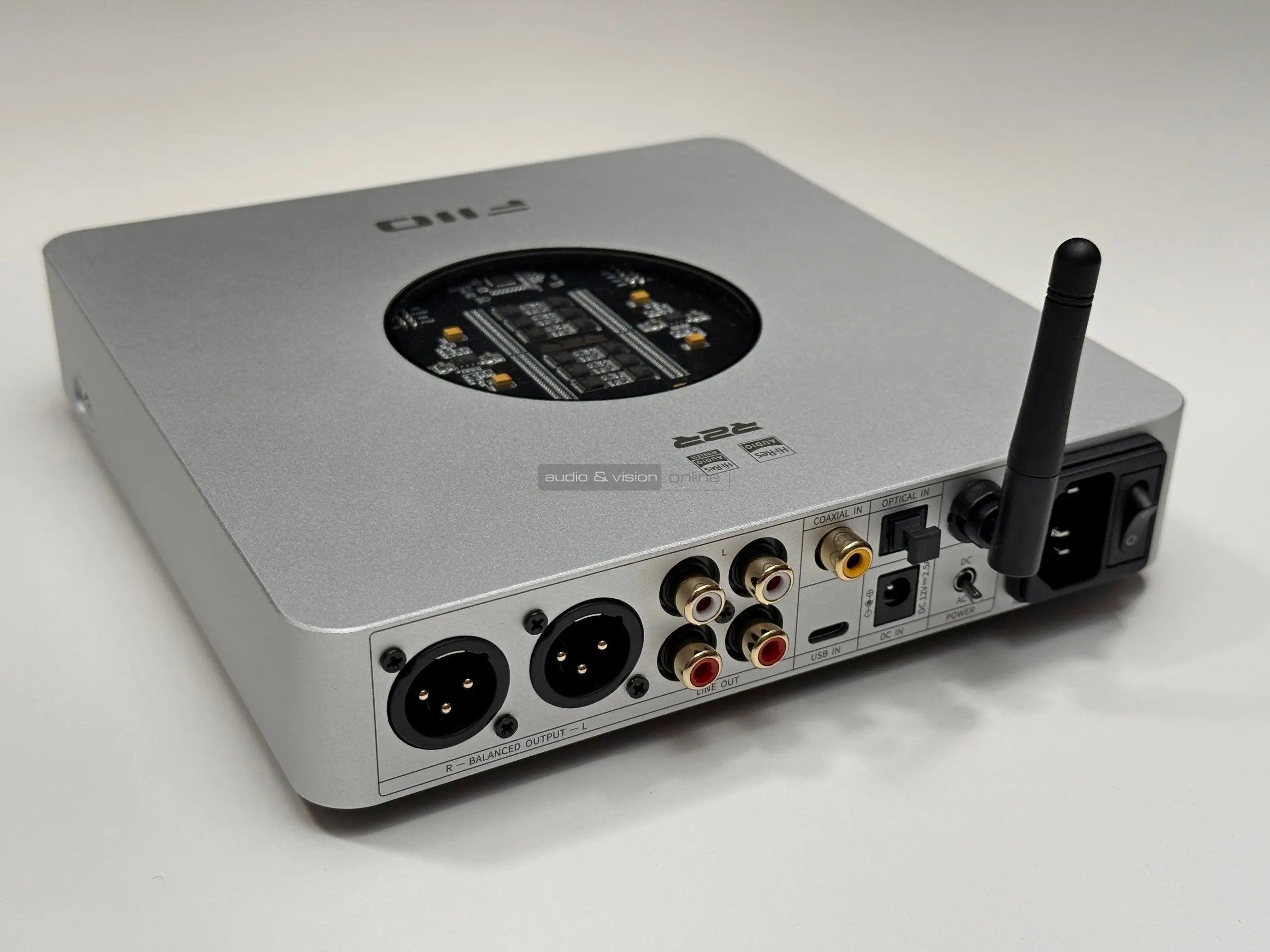 Aprócska doboz, aminek a tetején vágtak egy kerek nyílást, amit plexivel fedtek le, így működés közben is megcsodálhatjuk a DAC-unk belsejét. Az előlapi kijelző két oldalán helyezkednek el a tekerhető/nyomkodható kezelőszervek a beállításokhoz, amik használata erősen ajánlott a kihívásokat szerető hifistáknak, de szerencsére az elsődleges kezelőszerv a csomagban megtalálható távvezérlő amellyel kényelmesen elvégezhető minden beállítás (tehát még egyszer, távvezérlő!!! ebben a kategóriában) vagy használhatjuk a FiiO Control applikációval is. Itt találjuk a fejhallgató aljzatokat is. Hátul a már említett XLR kimenet foglal helyet a szokványos RCA mellett, amiből két párat kapunk. Van még természetesen USB, optikai és koaxiális bemenet is, sőt még egy 12 V aljzatot is kapunk, amin keresztül külső tápegységgel is etethetjük a kényes ellenállás hálózatot, de ott van a normál 230V tápaljzat is. Bluetooth (v5.4) kapcsolatot is kínál az összes fontosabb kodekkel - SBC, AAC, LDAC.