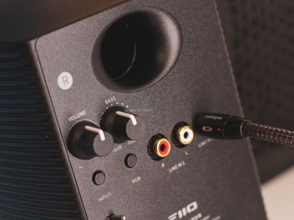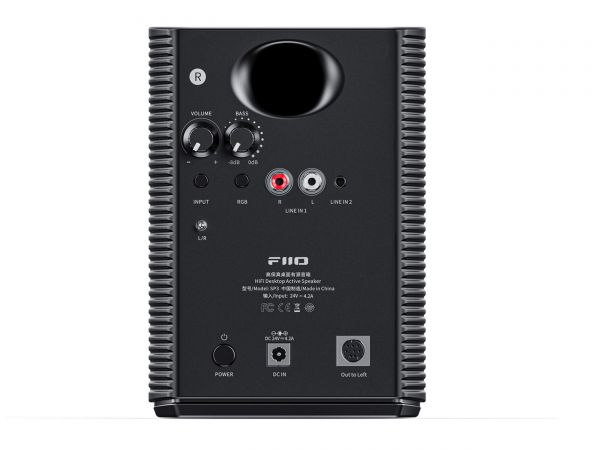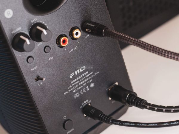 Az aktív hangdoboz hátulján egy-egy RCA és 3,6 mm-es Jack bemenet fogadja az analóg jelet. Fölöttük egy apró, könnyen forgatható jelszint (hangerő szabályzó) és basszusvezérlőt találtunk. Kerekített szélű reflextölcsérről is gondoskodtak a fejlesztők. A kivitel hozta a FiiO-tól elvárt szintet, az illesztések és az összeszerelés minősége kifejezetten tetszett. Amit kifogásoltunk, pusztán a talpak rögzítésének hiánya volt. A hangsugárzó és a gumitalpak között nem volt összefogó rész. Ha odébb toltuk, a kis doboz könnyen levált a talpról. Bár nem arra készült, hogy tologassák.