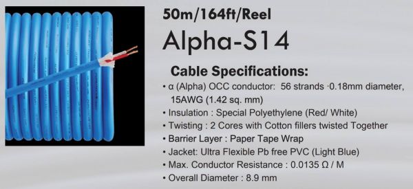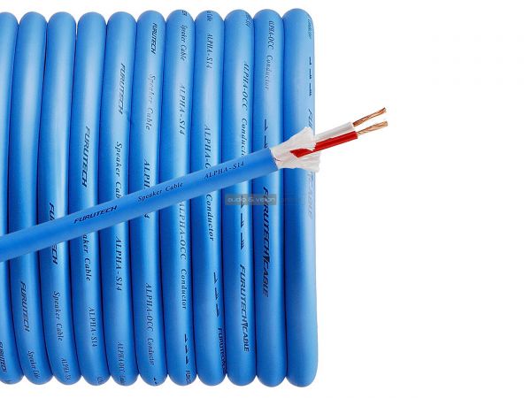 8,9 mm-es vastagságával az Alpha S-14 a Furutech legvékonyabb tetszőleges hosszban megvásárolható hangfalkábele, amely már Alpha OCC-t tartalmaz. 2 x 1,42 négyzetmilliméter keresztmetszetű sodort rézvezető található benne, amelyet speciális polietilén, majd papírszalag követ. Külső köpenye rendkívül rugalmas, világoskék PVC. A fotókon látható demó darabot a KáCsa technikusai öltöztették műanyag kábelharisnyába. Flexibilis kialakításának köszönhetően könnyebben lehet elvezetni kábelcsatornák, álmenyezetek, rack szekrények szűkös üregeiben. Nem kimondottan egyedi installációs célra tervezték, de magasabb kategóriás házimozi rendszerek, falra akasztható hangsugárzók kiegészítésére is ideális. A méterre értendő ár 16 180 Ft.