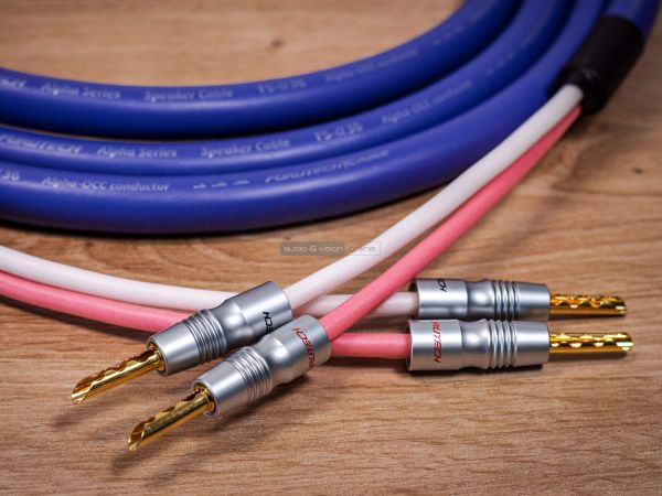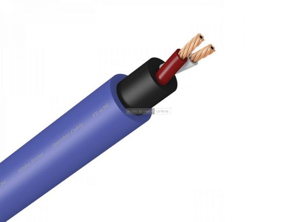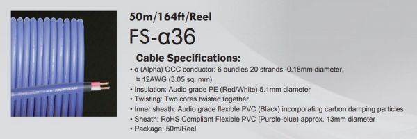 Az FS-Alpha 36 leírásából hamar kiderül, hogy konkrétan high end rendszerekhez készült, mindhárom résztvevő közül a legmagasabb minőség. Sodort Alpha OCC rézvezetőket tartalmaz melyek keresztmetszete 2x3 négyzetmilliméter. A polietilénnel szigetelt vezetőszálak egy központi magot vesznek körül, melyben csillapító hatású szén részecskék találhatók. A pozitív és negatív szálak után következő fekete PVC réteg is ilyen részecskéket tartalmaz. Mindezt lila PVC külső köpeny zárja le, a teljes külső átmérő 13 milliméter. Ahogy a fotók mutatják, ez a kábel Furutech FP-200BG banándugókkal szerelve érkezett hozzánk, a KáCsa ajánlása alapján. Egy méter ára cikkünk írásakor 45 190 Ft.