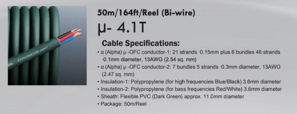 A Furutech Micro-4.1T kakukktojás, mert benne még nem monokristályos OCC, hanem az egyszerűbbnek számító OFC (pontosabban Micro OFC, vélhetőleg a "sima" OFC módosított változata) vezetőanyag található. Ugyanakkor ez a trió egyetlen tagja, amely négy vezetőszálat tartalmaz, eleve kettős kábelezésre vagy kettős erősítésre szolgál. A Micro-4.1T-ben 2,5 négyzetmilliméter keresztmetszetű sodort rézszálak (4 kötegben) gondoskodnak az átvitelről, színkódolt polipropilén belső és sötétzöld PVC külső szigeteléssel. 11 milliméteres teljes vastagságához lágy, rugalmas kivitel társul, könnyen befűzhető szűk helyekre is.