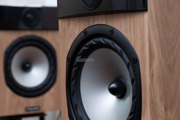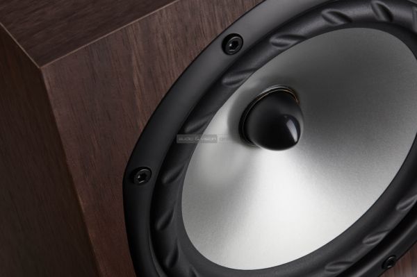 Ez alatt találjuk a 150 mm átmérőjű mély/közép hangszórót, aminek membránja szálerősített anyagból készült. A szerkezet fém kosarat kapott, a porsapka helyén pedig fáziskúpot visel. A membránszélekre is érdemes egy pillantást vetni, mivel itt is az árkategóriában elvártnál kicsit többet kapunk. A gumiperem ugyanis a cég Fyne Flute nevű, hullámos, vagy ha úgy tetszik, bemetszett mintázatú darabja, még a legkisebb modellben is.