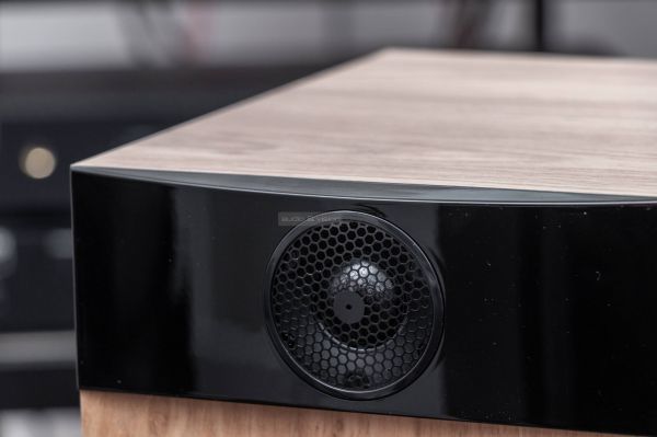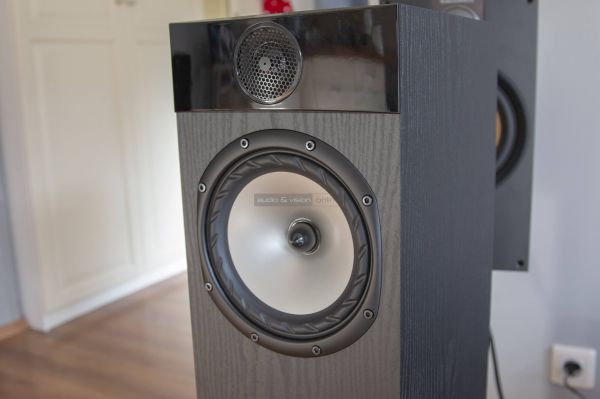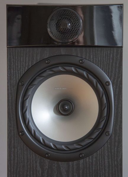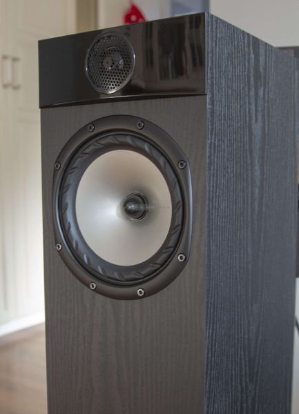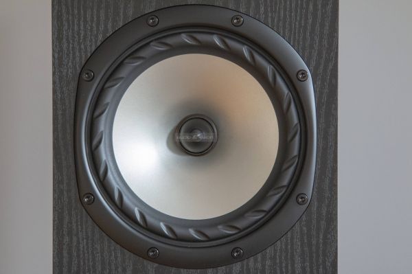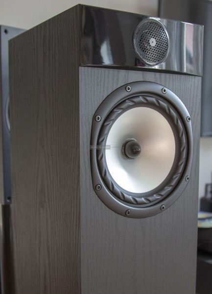 Kissé meglepő a hangszórók elölnézeti elrendezése: a 25 mm-es poliészter szövet dóm egy fényes, szintén fekete, hajlított műanyag sávban foglal helyet a hangsugárzó tetejéhez közel, természetesen - fém - védőrács mögött, alatta láthatjuk a 150 mm-es, Fyne Flute - azaz bemetszett - kialakítású gumiperemmel ellátott és multi-fibre szálerősített membránnal rendelkező mélyközép sugárzót. Utóbbi fémkosaras, közepén fényes fekete fáziskúpot láthatunk egyszerű porsapka helyett.