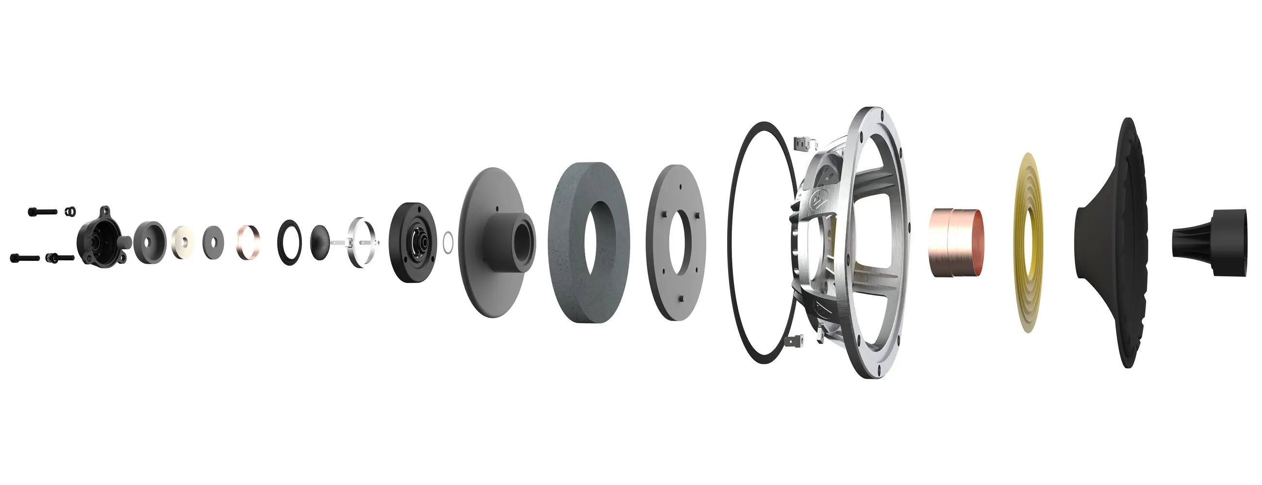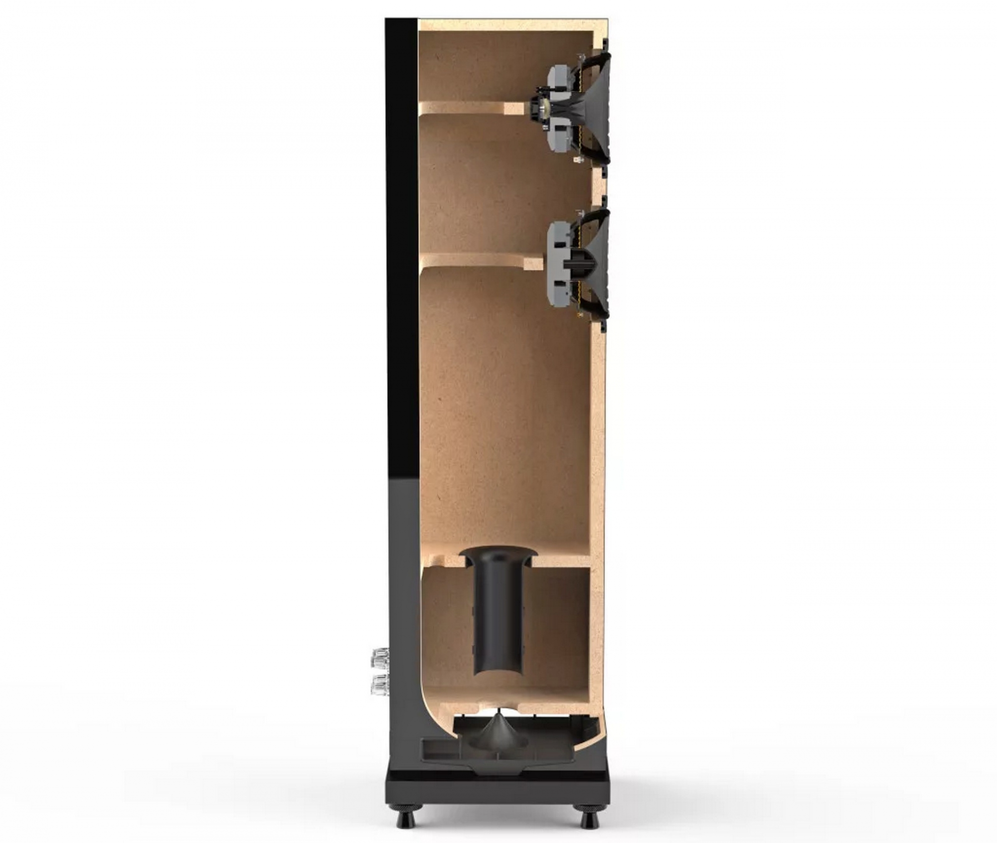Az utóbbi mögé neodímium mágnest illesztettek, kapott szellőztetett hátsó kamrát, a magnézium HF membrán csökkenti a rezonanciát és 34 kHz-ig működik. Az IsoFlare mélyközép hangszóró FyneFlute peremű, a rögzítéshez pedig alumíniumgyűrűt is alkalmaztak, ami azért a megjelenésen is sokat dob. Ugyanezt vetették be a 150 mm-es mélysugárzónál is, ami közvetlenül alá került, a segítségükre pedig szintén BassTrax Tractrix diffúzor rendszert használtak, amit szépen beépítettek a hangfal aljába. Ezáltal a hang, főleg az alsótartomány 360 fokos szögben terjed a hangdobozból, ami annak az elhelyezését is megkönnyíti.
