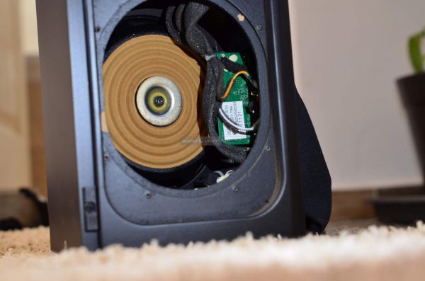 Gyári állapotukban a hangdobozok lényegében semmiféle említésre méltó részletet nem tartogattak számunkra, legfeljebb a kábelcsatlakozóknál volt némi látnivaló. Itt találtuk meg a beépített erősítő IEC tápkábel aljzatát, egy jó minőségű, banándugós hangfalkábel csatlakozót, valamint egy LFE bemenetet, illetve az aktív mélysugárzóknál megszokott szabályzó gombot.