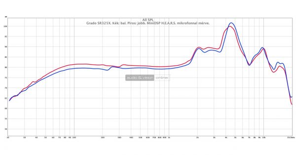 A Grado SR325X frekvenciagörbéje 100 kHz alatt kissé sovány (azért alábecsülni sem kell, a határain belül még gazdagon visszaad egy orgonát vagy nagybőgőt), 20 Hz-től 15 dB-lel kisebb hangnyomásszintet mutat, mint a 100 Hz-től 1,8 kHz-ig érő, szép egyenletes szakasz. Viszont 5 kHz-nél majdnem 20 dB-t ugrik felfelé, majd 10 kHz után fokozatosan lehanyatlik. A basszusokat leszámítva olyan, mintha fejlesztői a Harman célgörbéhez próbálták volna igazítani, ami nem baj. Utóbbit jobban megközelíti, mint a hasonló összegért kapható Sennheiser HD 600. Figyelemreméltó, hogy a jobb és baloldal milyen összhangban üzemel.