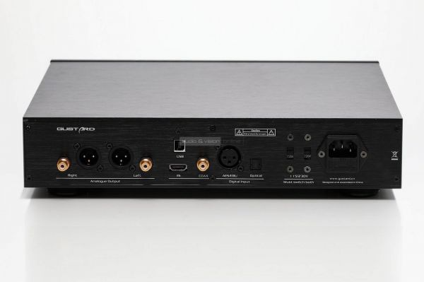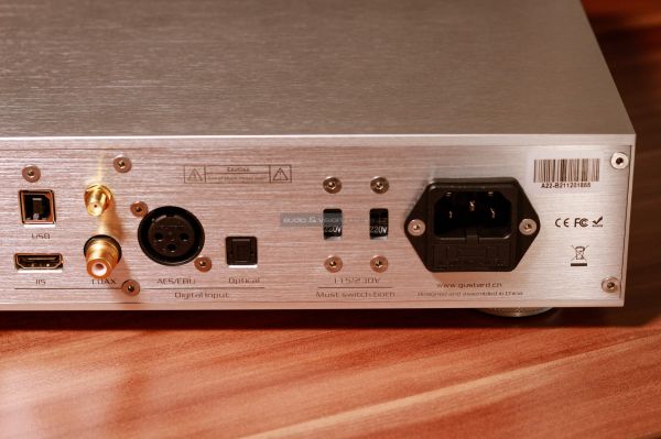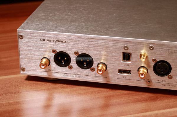 A Gustard A22 a szexitől meglehetősen távol álló - bár a mai világban a fene tudja - fenekére nézve találunk egy pár XLR, egy pár RCA kimenetet, a szokásos digitális bemenetekkel fűszerezve, azaz USB, IIS LVDS, koaxiális, AES/EBU, optikai, két kapcsolót (két trafó van!) a hálózati feszültség beállítására és egy szabványos IEC tápcsatlakozót. Itt jegyezzük meg lábjegyzetben, hogy a tápcsatlakozó alatti részen található a biztosíték, amit így igen egyszerűen lehet cserélni, nem kell a készüléket megbontani hozzá.