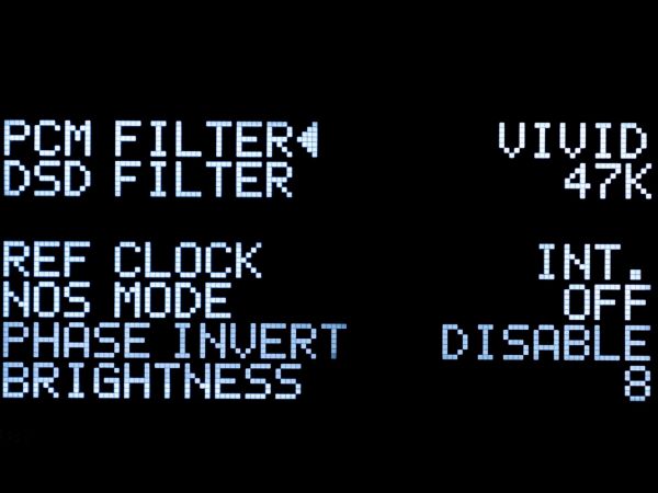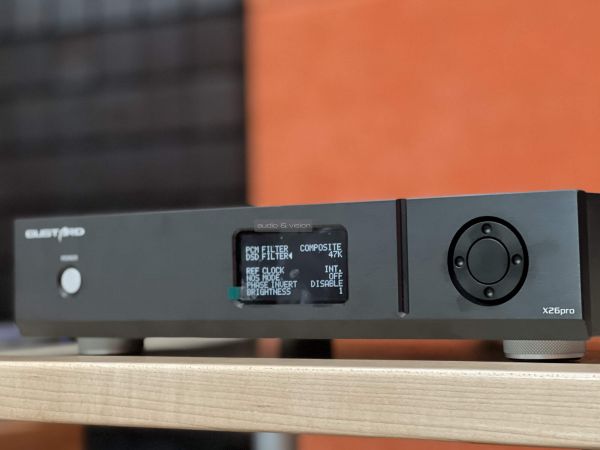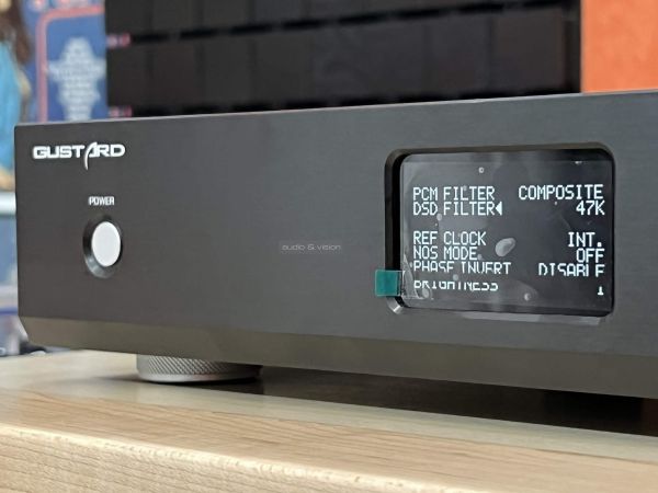 A DSD szűrővel a levágási frekvencia állítható be 47 K, 50 K, 60 K vagy 70 K értékre, az alacsonyabb érték simább, a magasabb élesebb felső tartományt eredményez, ezt a gyári 47 K értéken hagytuk. Az X26 Pro-ban egy precíz femtoszekundum pontosságú órajel generátor dolgozik, de lehetőség van külső órajel generátor használatára is, amit a menüben lehet (kell) beállítani (maga a Gustard is gyárt már ilyeneket C16 és C18 típusjellel). A következő beállítási lehetőség a NOS, amellyel a túlmintavételezés állítható be/ki. Bekapcsolt NOS állásban (amikor a túlmintavátelezés ki van kapcsolva, hiszen a NOS ezt jelenti) a hangzás végképp elbillent a meleg irányba, főleg a "Gentle" szűrőállásban, amit mi nem tudtunk tolerálni, ezért a túlmintavételezést bekapcsolva hagytuk. Az utolsó két lehetőség a fázis és a fényerő állítási lehetőség, az utóbbi 8 lépésben lehetséges, de a kijelzőt nem lehet teljesen kikapcsolni. Elsőre tehát úgy tűnhet, hogy a PCM/NOS filterek jelenléte miatt egy széleskörűen konfigurálható készüléket birtoklunk, ami nem vitás, de számunkra kizárólag a composite/NOS OFF állás nyújtott élvezhető végeredményt, a lehetőség azonban adott a próbálgatásra.