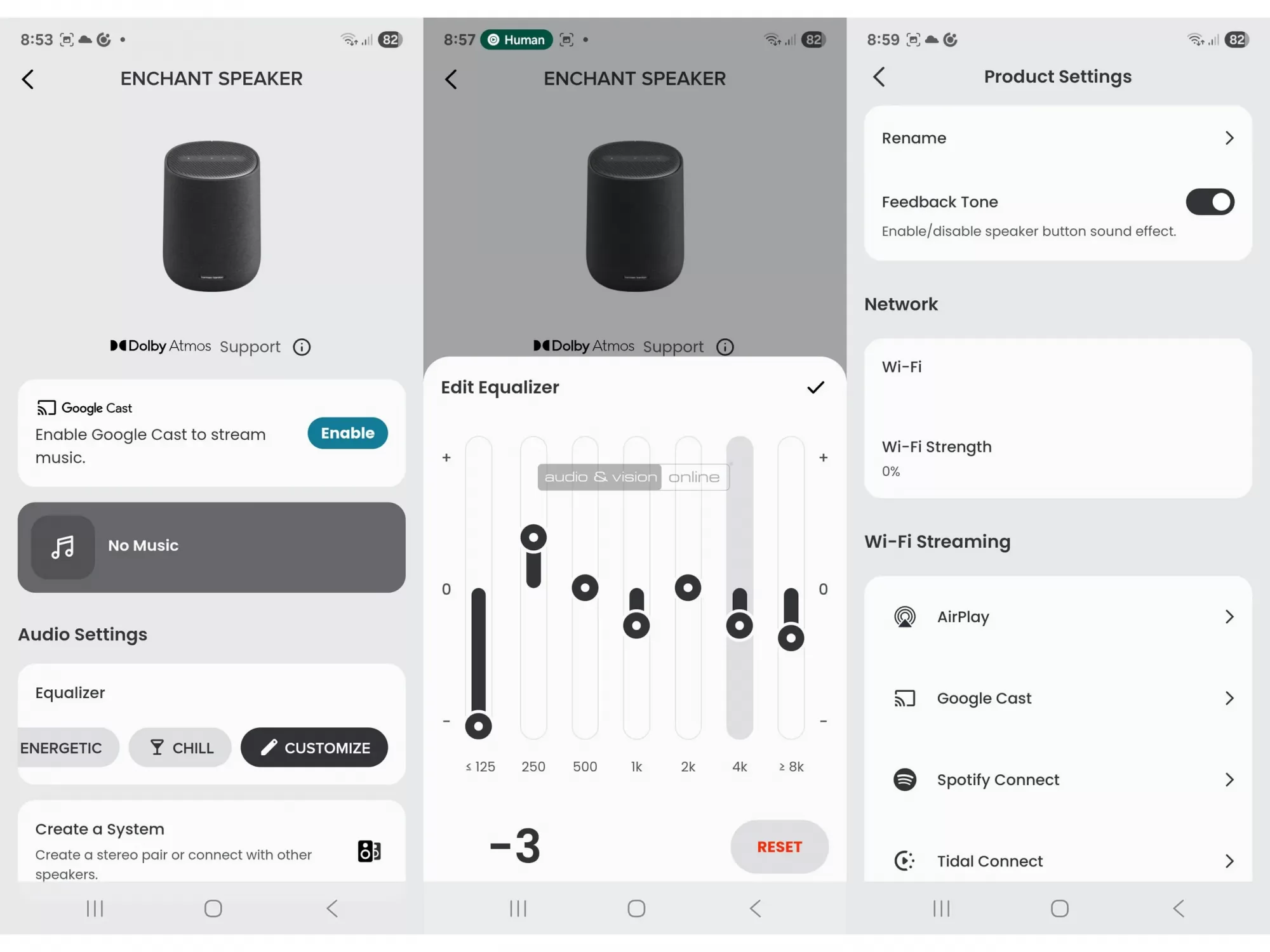 A Harman Kardon ONE alkalmazás segítségével tudjuk engedélyezni, hogy Google Cast képes legyen az eszköz. Ugyanitt létre tudunk hozni vezeték nélküli sztereó rendszert, két Citation Enchant Speaker alkalmazásával. Hangszínszabályzásra (EQ) ugyancsak van lehetőség, és a széles átlag 2 vagy 3 sávja helyett itt 7 csúszkát kapunk, hogy a mély/közép és közép/magas frekvenciákat is jobban a saját ízlésünkhöz tudjuk igazítani. Számos további lehetőséget nyit a ONE felülete, például Auracast alapú összekapcsolást, ha több hangrendszerrel szeretnénk egy nagyobb teret betölteni.