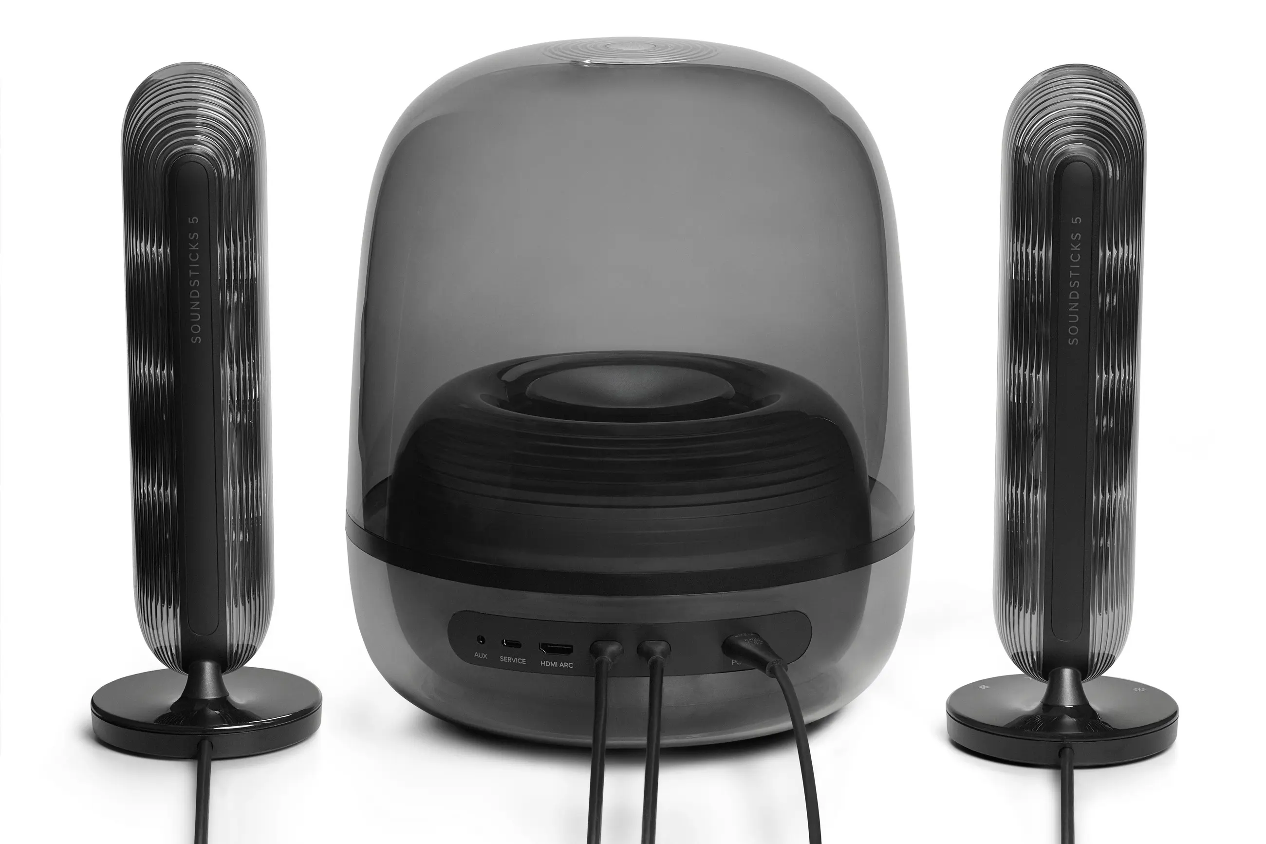 A Harman Kardon SoundSticks 5 megjelenése egyszerre tiszteleg a múlt előtt és mutat a jövőbe. Az átlátszó kialakítás továbbra is a legfontosabb stíluselem. A Black (fekete) verzió esetében a polikarbonát ház egy enyhén füstös, sötétített tónust kapott, amely még elegánsabbá teszi a megjelenést, miközben a belső alkatrészek többé-kevésbé láthatóak, de diszkrétebben simulnak bele a látványba.
