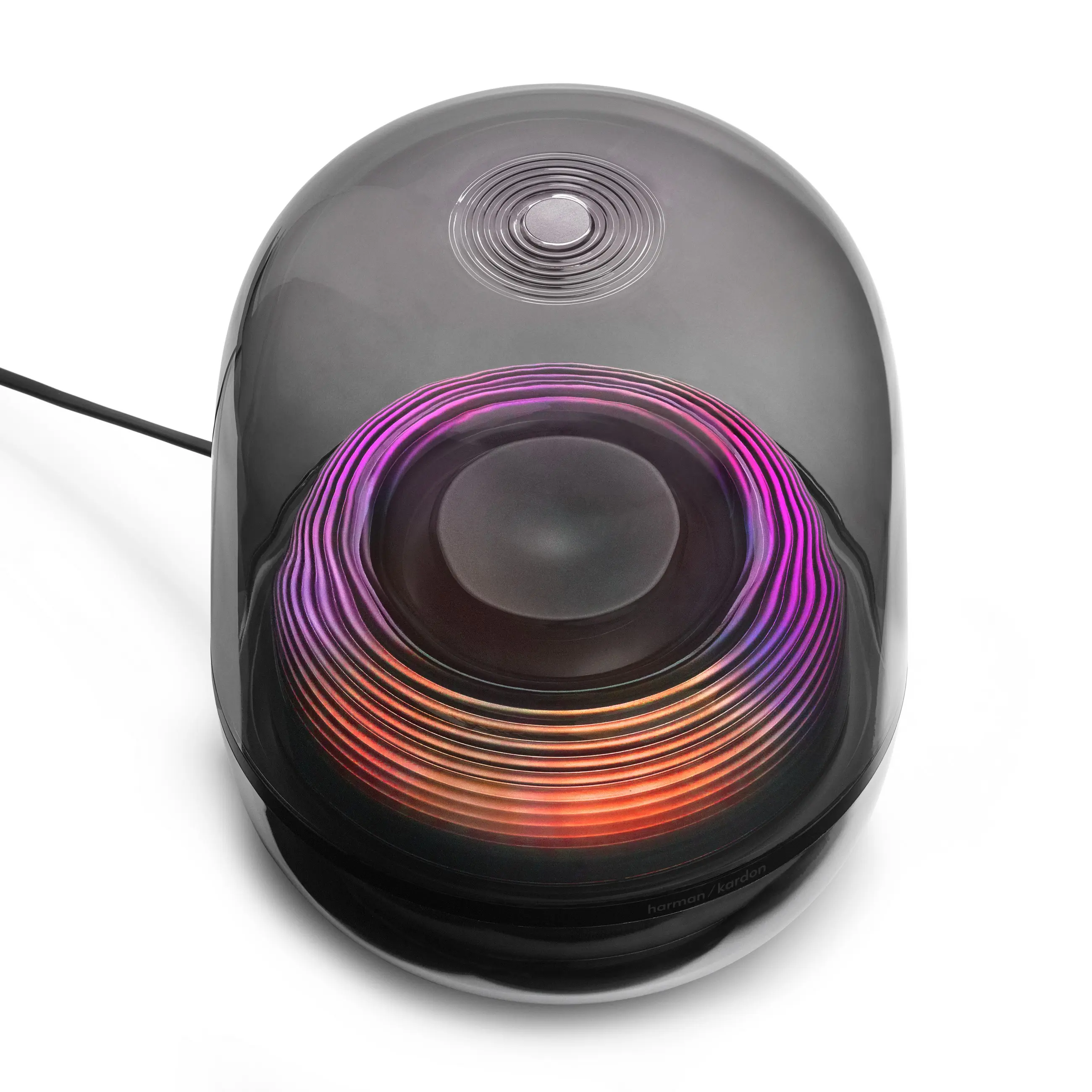 Tesztalanyunkban RGB LED világítást alkalmaztak, ami impozáns, bár kétélű fegyver. Különböző tónusokat tudunk beállítani telefonos alkalmazáson keresztül, melyek egyfajta pulzáló, derengő hangulatfényt eredményeznek. Mindez különösen a mélysugárzónál érvényesül, egyfajta háromdimenziós, görbített fényjátéknak lehetünk szemtanúi, egyesek akár az Interstellar Gargantuáját is beleképzelhetik. A Harman Kardon hasonló koncepciót alkalmazott az Aura Studio 5 hangrendszerénél, bár ott eltérő optikai trükköt alkalmaztak és az eredmény látványosabb is lett.