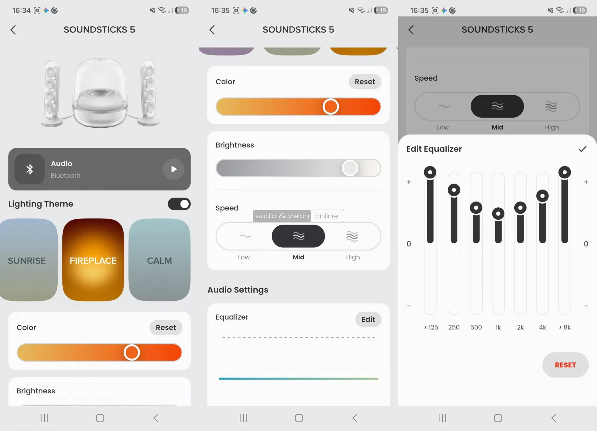 A Harman Kardon One alkalmazásban a hangerő és a némítás gombokon kívül testre szabhatjuk az Ambient Lightshow dinamikáját is. Beállíthatjuk a fényerőt, vagy akár teljesen ki is kapcsolhatjuk a világítást, ha sötétben szeretnénk filmet nézni. Létre tudunk hozni egyéni 7 sávos EQ profilt, ezt akkor is érdemes kipróbálni, ha a közép és magas hangok mennyiségével elégedettek vagyunk. Esetünkben egy dolgozószoba sarkában helyeztük el a rendszert, ami túlságosan búgó mélyekkel járt, de a 125 Hz alatti és 250 Hz-es csúszka enyhe leszorításával sikerült egyenletesebb basszust elérni.
