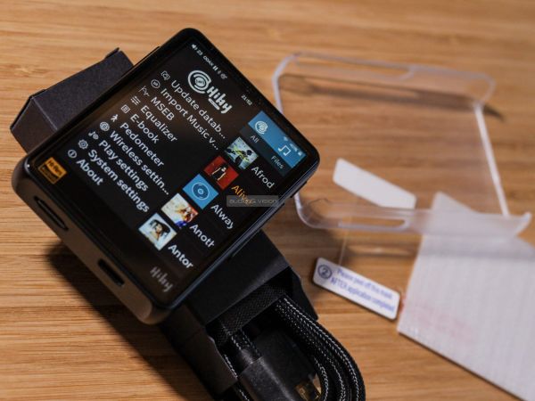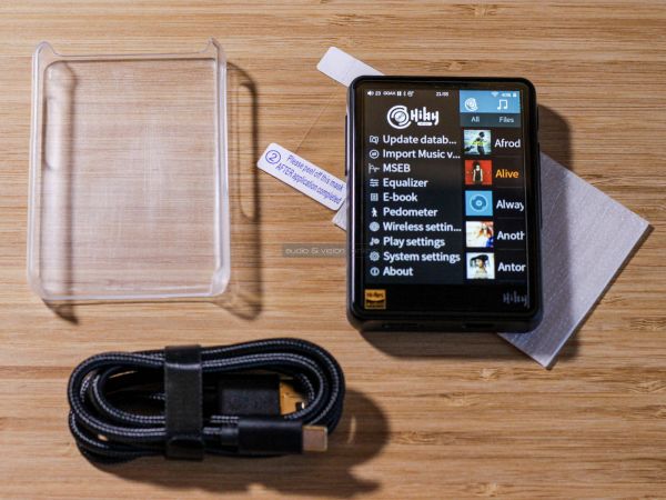 A HiBy R3 Pro Saber doboza néhány kiegészítőt is tartalmaz: USB-C kábelt, védőfóliát a kijelzőhöz és egy félig átlátszó, műanyag védőkeretet. Párezer forintért vásárolható fekete műbőr tok is a lejátszóhoz, amely az alapértelmezett opcióhoz viszonyítva jobban néz ki és hatékonyabban véd.