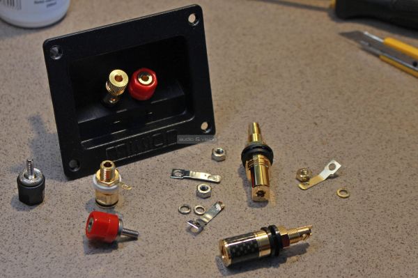 A projekt alatt nemcsak a belső kábelezés módosult, hanem a hangfalon lévő banándugó aljzat is. A standard minőségű, nikkel bevonatú műanyag szorítófejes banándugó-kompatibilis aljzat helyére tartósabb, jobb anyagminőségű darabok kerültek. A KáCsa Audió kínálatában sokféle banánaljzat található, néhány példa közülük az alábbi képen: