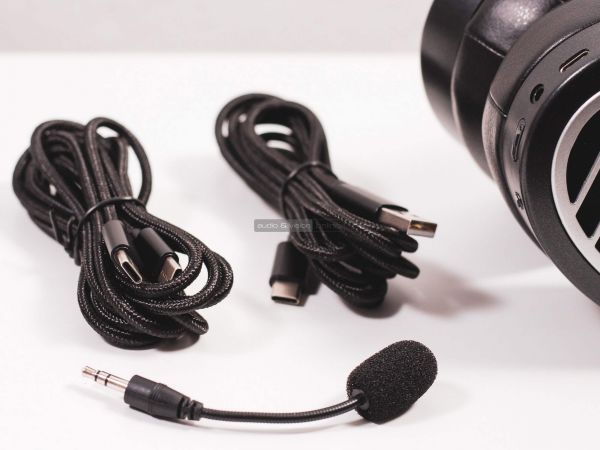 A csomagolás masszív hordtáskát is tartalmaz. A tokot felnyitva, kis zsákból kerül elő egy igényes külsejű USB-C-C és USB-A-C kábel, amelyek a töltést, vagy közvetlen számítógépes kapcsolatot szolgálják. Jack dugós külső mikrofon is része a tartozékoknak.