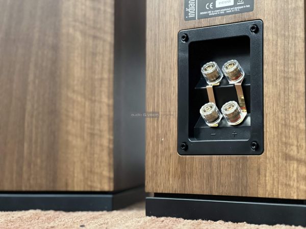A reflexcső szép, lekerekített peremű nyílása elől van, így hátsó falhoz közeli elhelyezés esetén nem dúsul fel drámaian a basszus. Amennyiben már hátul járunk, akkor mindenképpen meg kell említenünk a dupla kábelezést vagy erősítést nyújtó bemeneteket, amelyek teflon szigetelést kaptak, és egy külön kis mélyedésben helyezték el őket.