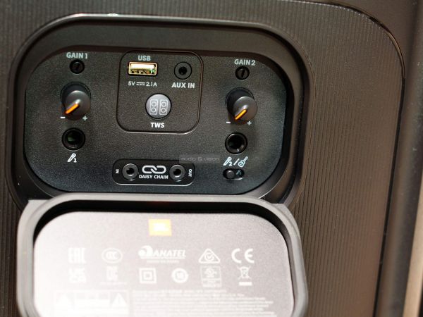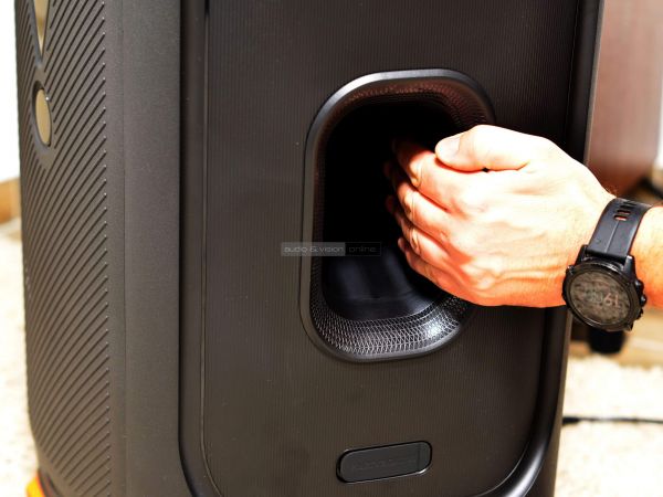 A hátlapban gondosan eltűntetett és cseppálló (IPX4) fedéssel takart csatlakozó egység tartalmazza a legfontosabb be- és kimeneteket a gitárhoz, mikrofonhoz, a vezetékes és vezeték nélküli sztereó módhoz (TWS) és egy AUX bemenet is helyet kapott itt. Rögtön alatta egy hatalmas reflexnyílást találunk, ami egyértelművé teszi, hogy egy szobácskában nem igazán érdemes túl közel rakni a popóját a falhoz, mert tetemes légmennyiség fog ott mozgolódni, ha jobban megkergetjük azt az állítólagos 800 wattot.