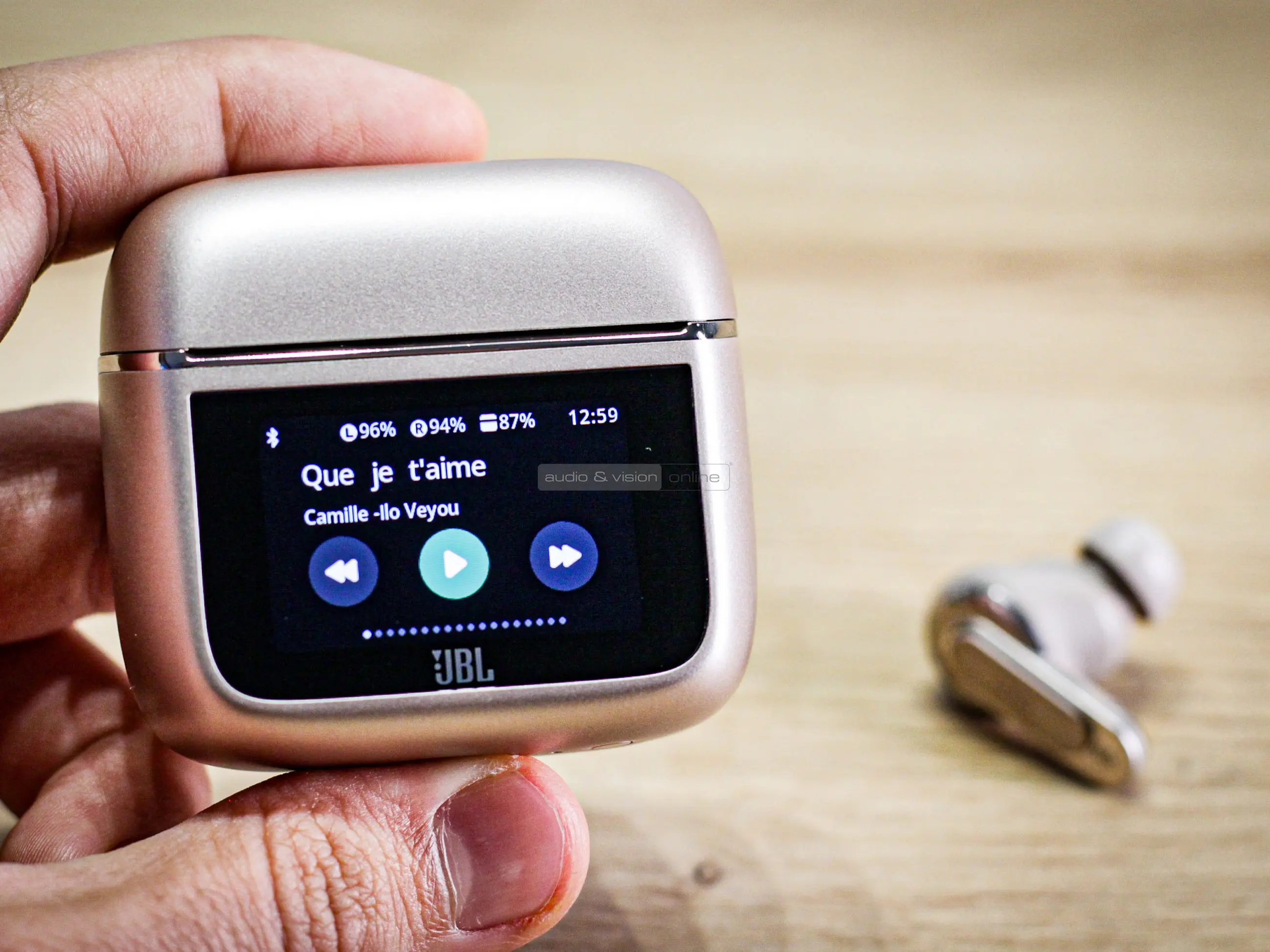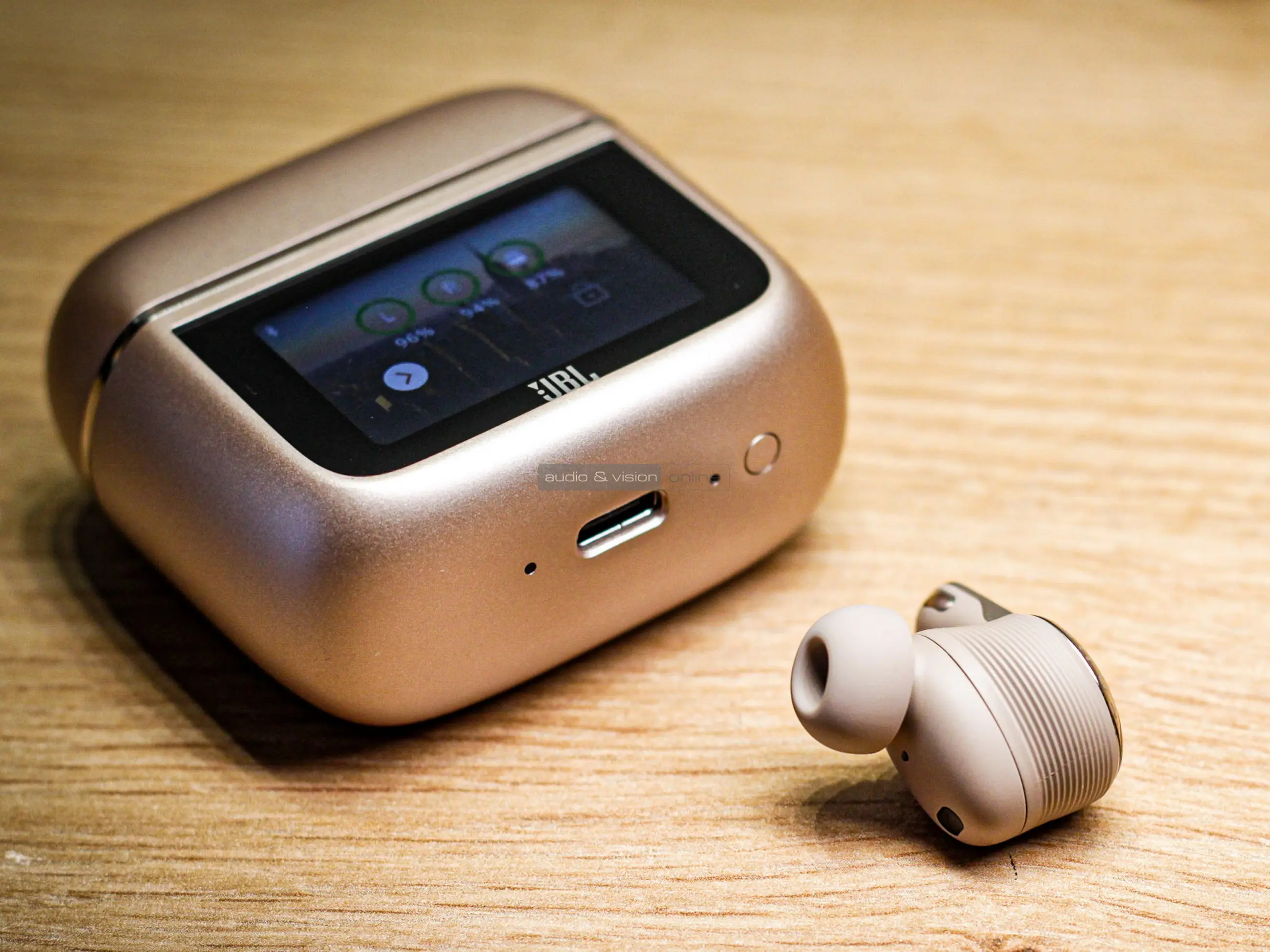 A fülhallgató és a töltőtok is tartalmaz csillogó részleteket, ami különösen a latte kiadásnak kölcsönöz némi ékszeres hangulatot. Viszont a fülhallgatók nem kimondottan hivalkodók, ami szerintünk inkább előny. A töltőtokon nem lehet nem tudomásul venni a rajta lévő, színes kijelzőt, mely minden fedélnyitást és zárást követően mutatja a fülhallgatók, illetve főakkumulátor töltöttségi szintjét, feloldást követően pedig az almenüket. Kérdés, hogy mennyire fog karcolódni idővel. Kissé hajlamos volt ujjlenyomatok gyűjtésére, de azt leszámítva nem támadt vele vizuális gondunk.