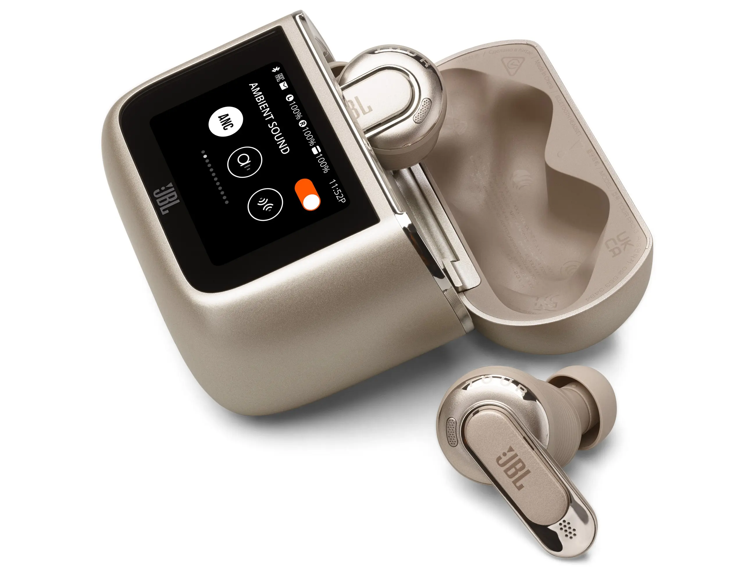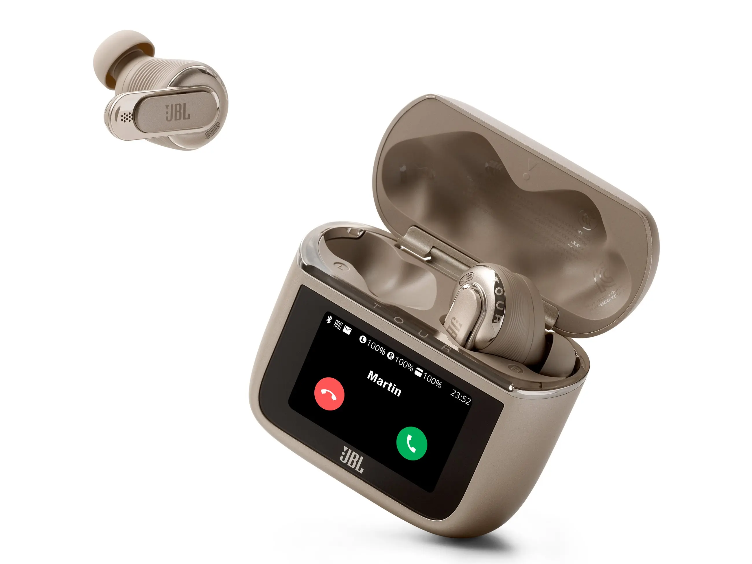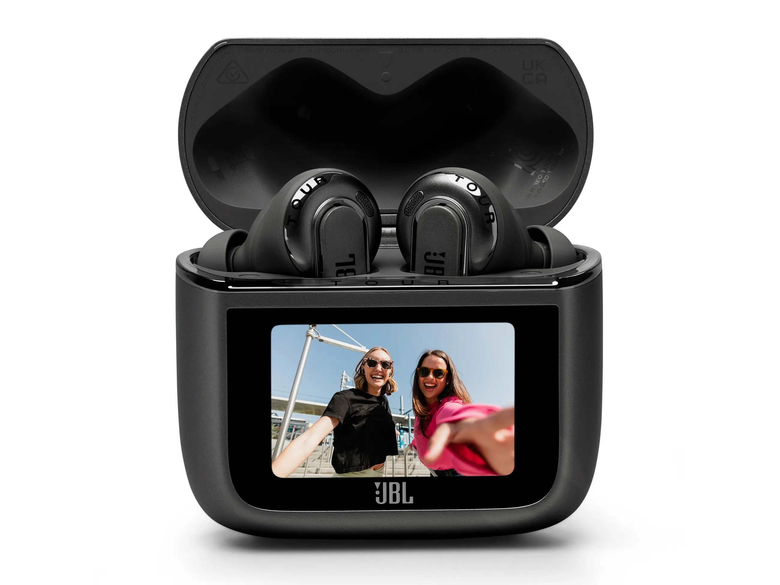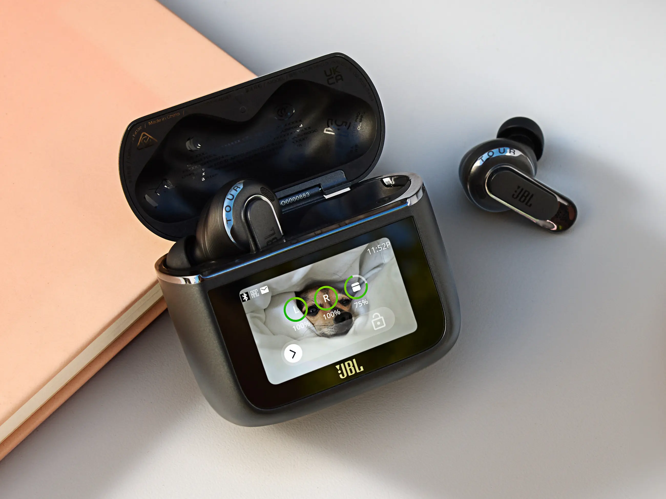 A füles a JBL által védjegyezett Smart Charging Case tokban fészkel. Érdekessége, hogy saját kijelzővel rendelkezik, ami teljes hozzáférést enged a beállításokhoz. Meg kell említeni a 3. generáció újítását is, nevezetesen a töltőtok Bluetooth adapter és Auracast funkcióit. A mellékelt Jack vagy USB-C végű kábeleket a tokon lévő aljzathoz csatlakoztatva nemcsak vezeték nélküli, hanem hagyományos forrás (TV, számítógép, repülőgépek médiarendszere stb.) továbbítható a fülhallgatókhoz. Az Auracast támogatással arra is lehetőség nyílik, hogy megosszuk másokkal, amit épp hallunk. Utóbbi lényege, hogy a tokban egy Bluetooth küldő is dolgozik, mely a Tour Pro 3 fülhallgatótól eltérő Bluetooth hangeszközzel is össze tud kapcsolódni.