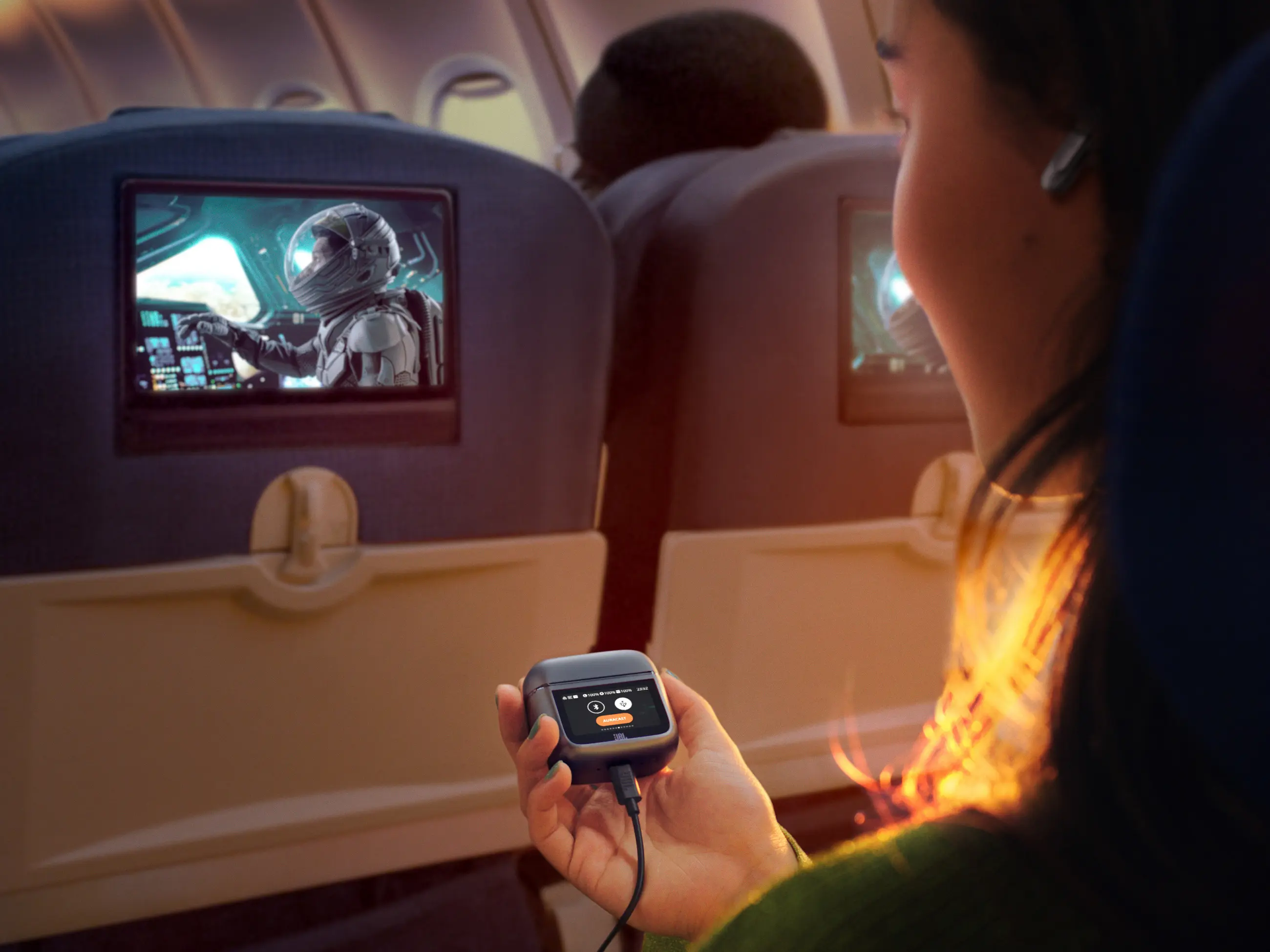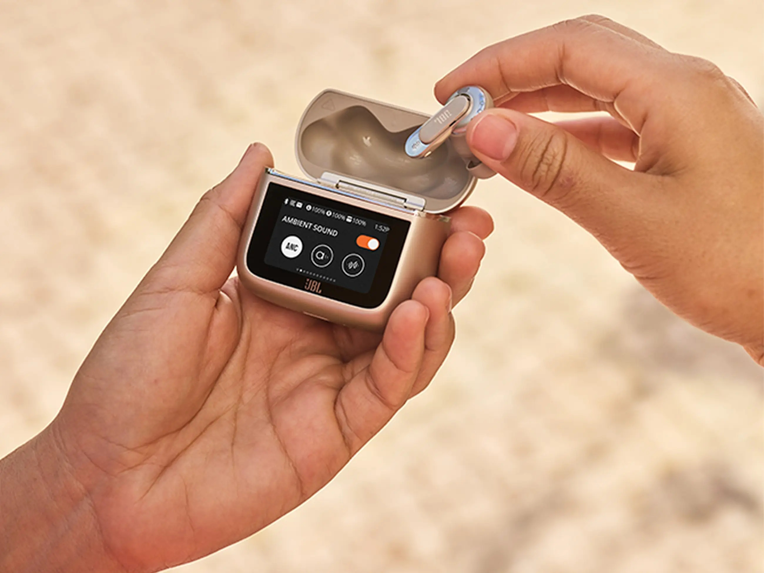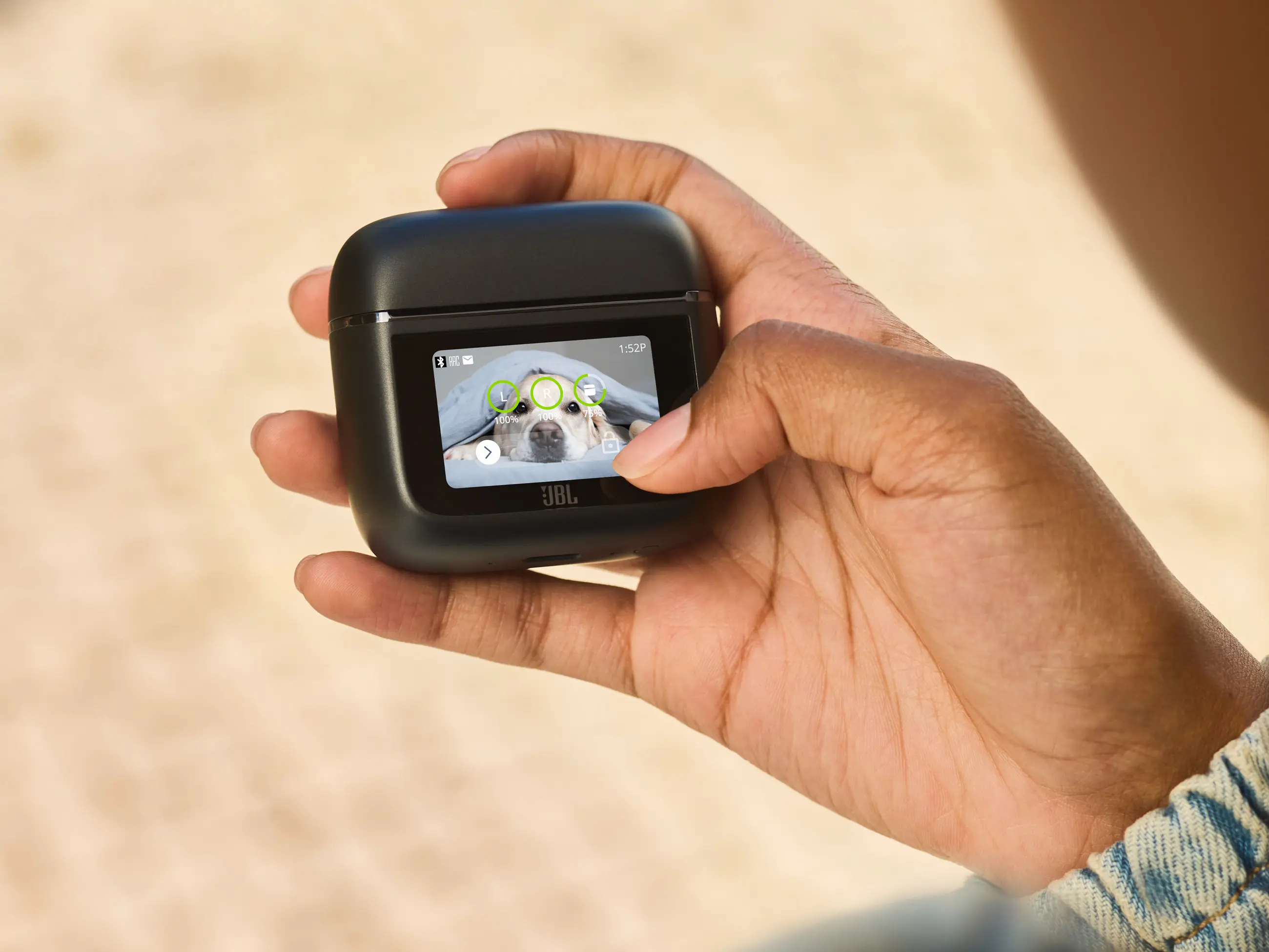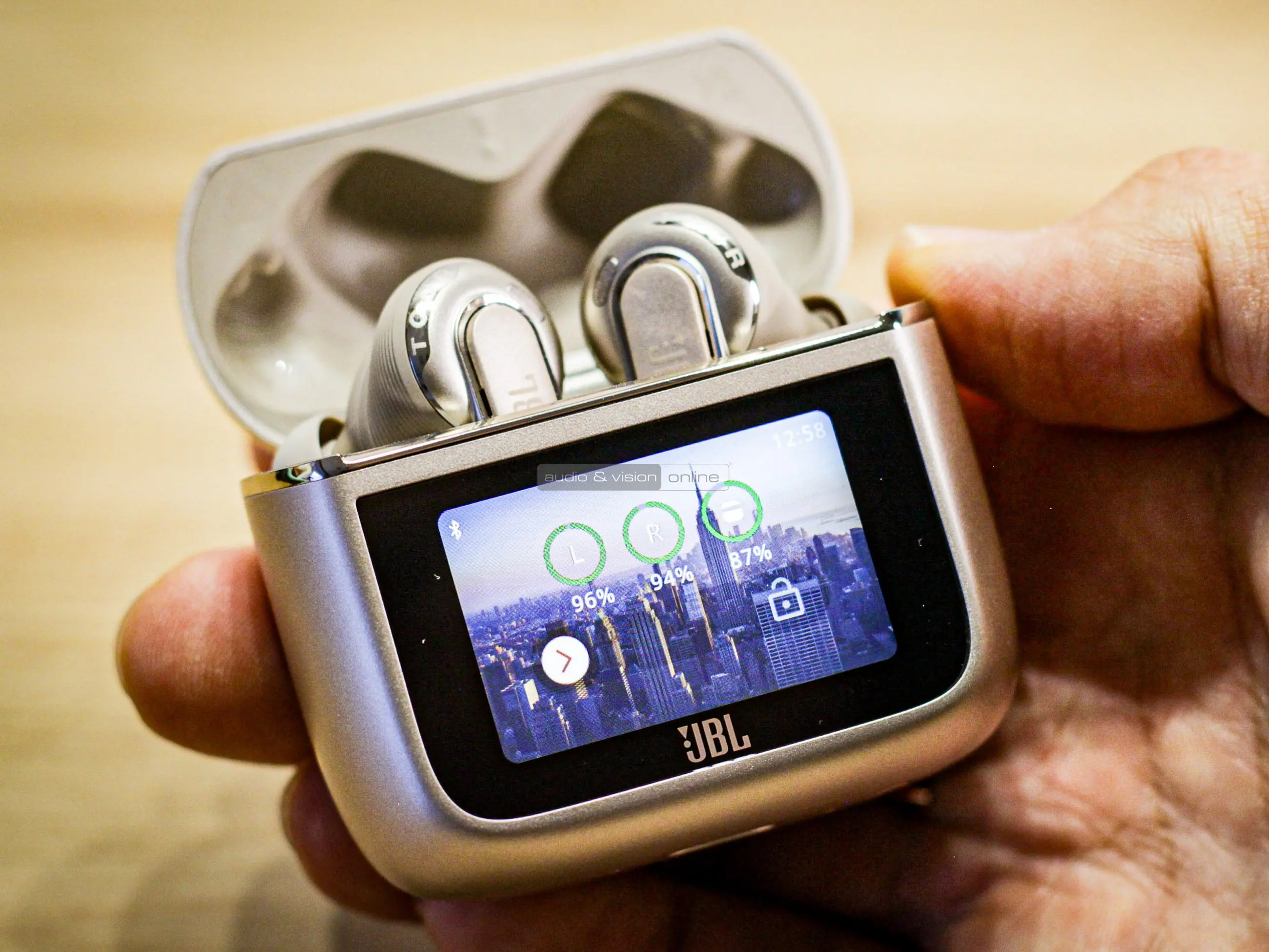 A füles a JBL által védjegyezett Smart Charging Case tokban fészkel. Érdekessége, hogy saját kijelzővel rendelkezik, ami teljes hozzáférést enged a beállításokhoz. Meg kell említeni a 3. generáció újítását is, nevezetesen a töltőtok Bluetooth adapter és Auracast funkcióit. A mellékelt Jack vagy USB-C végű kábeleket a tokon lévő aljzathoz csatlakoztatva nemcsak vezeték nélküli, hanem hagyományos forrás (TV, számítógép, repülőgépek médiarendszere stb.) továbbítható a fülhallgatókhoz. Az Auracast támogatással arra is lehetőség nyílik, hogy megosszuk másokkal, amit épp hallunk. Utóbbi lényege, hogy a tokban egy Bluetooth küldő is dolgozik, mely a Tour Pro 3 fülhallgatótól eltérő Bluetooth hangeszközzel is össze tud kapcsolódni.
