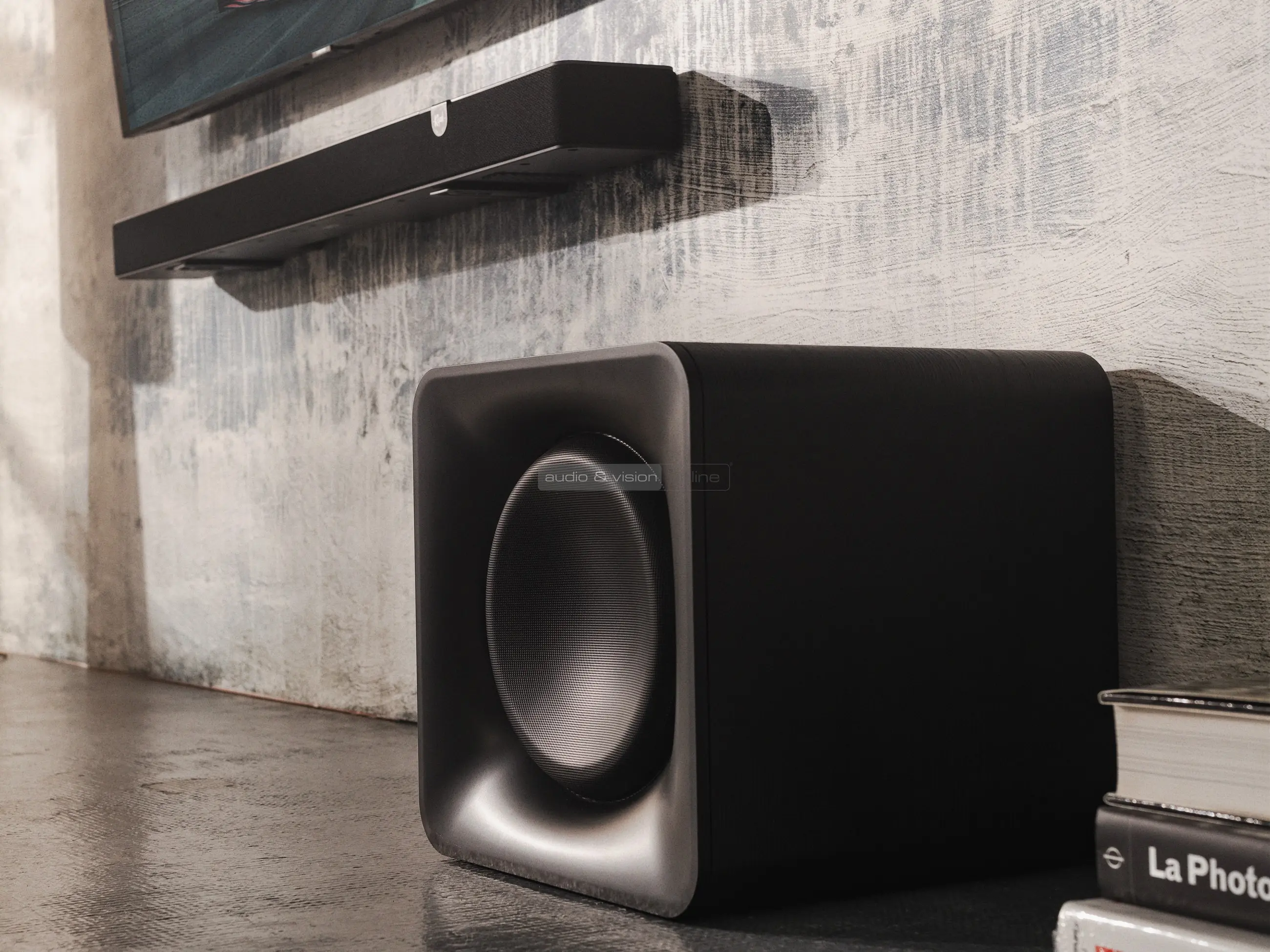 A finom háló mögött megbújó meghajtók által felálló 3.1.2 rendszer így összesen 9 hangszóróból áll, név szerint 6 db 57 mm-es középsugárzó, ezekből kettő az atmos hangokért felel a plafon felé fordítva a hangrúd szélein, kettő ugyanitt sugároz előre, további kettő pedig a dedikált center csatornában hivatott pazar középfrekvenciát kreálni a 20 mm-es selyem dóm magas sugárzóval karöltve. Ez még nyilván nem indokolná sem a 8,5 kg-ot sem pedig 43 Hz-es alsó tartományt (ami amúgy 20 kHz-ig terjed), de a Core 200-as ugyanúgy megkapta a 2 db 100 mm-es mélysugárzókat, amivel viszont már minden magyarázatot megkaptunk.