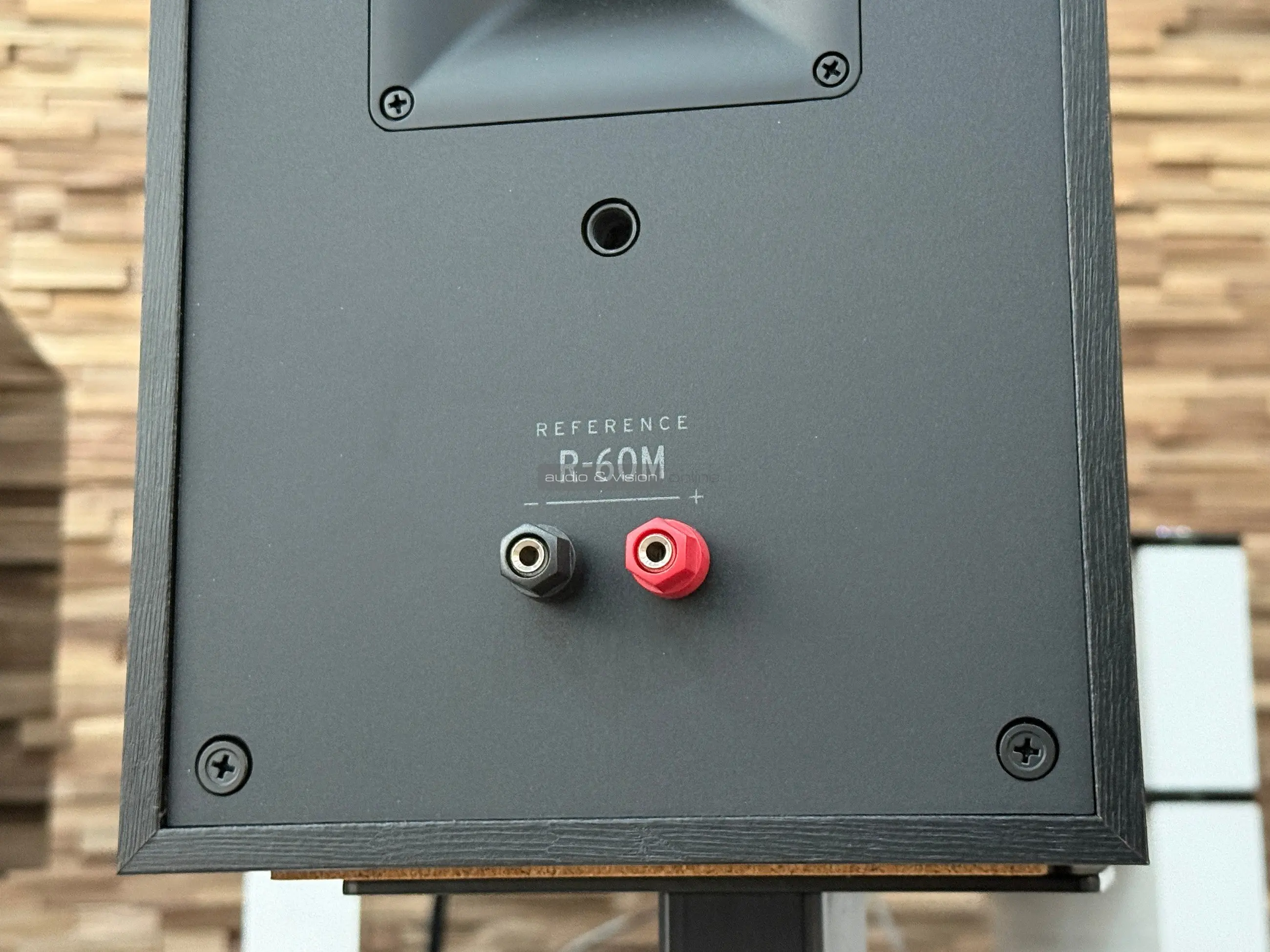 A Reference R-60M kétutas, basszreflex rendszerű hangdoboz, az elég hosszú reflexcső a kistesóhoz hasonlóan hátul és középen foglal helyet, ami alá helyezték a szintén ismerős szimpla, műanyag bevonatú bemenetet, amibe a banándugó is belefér.