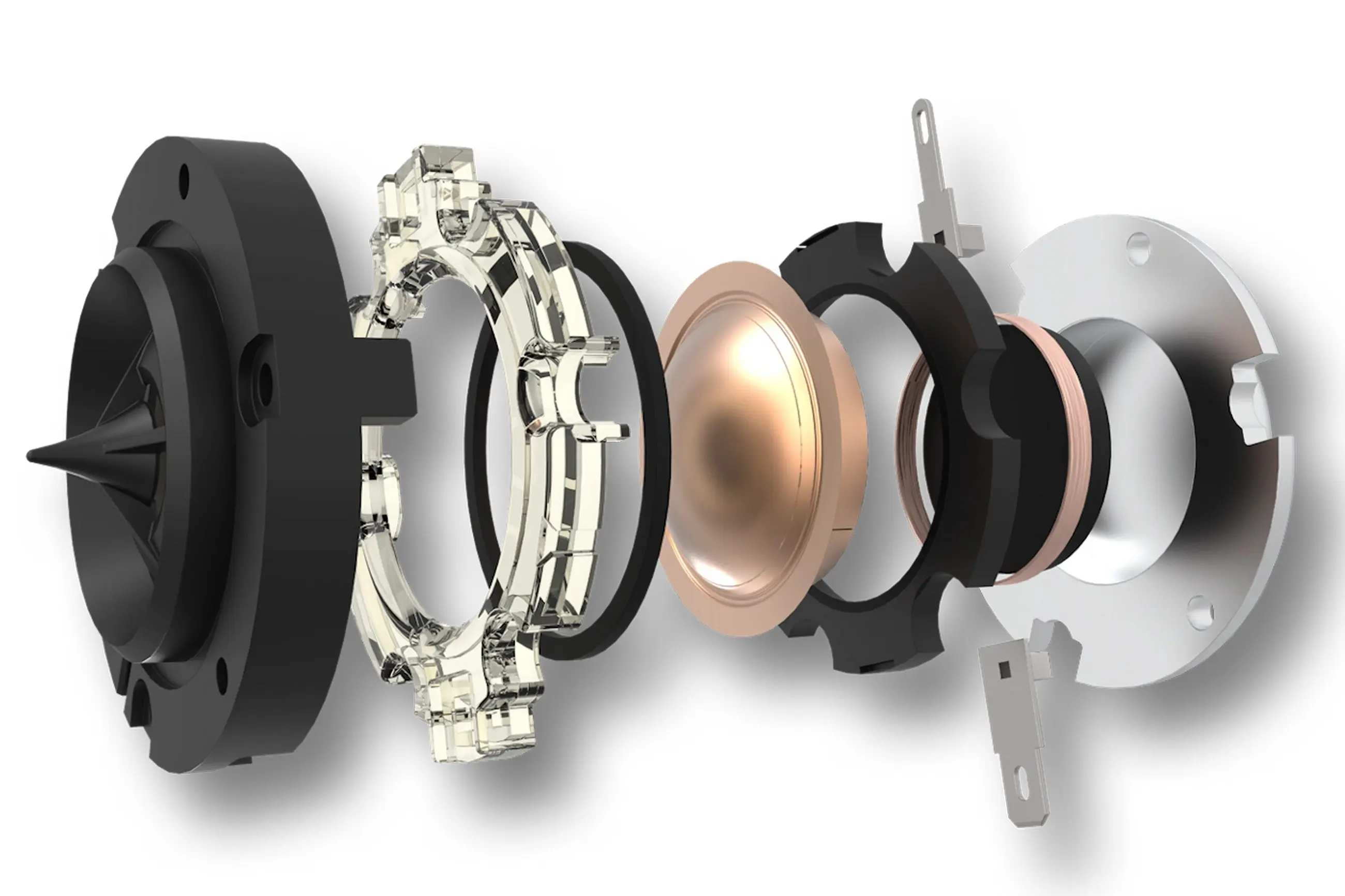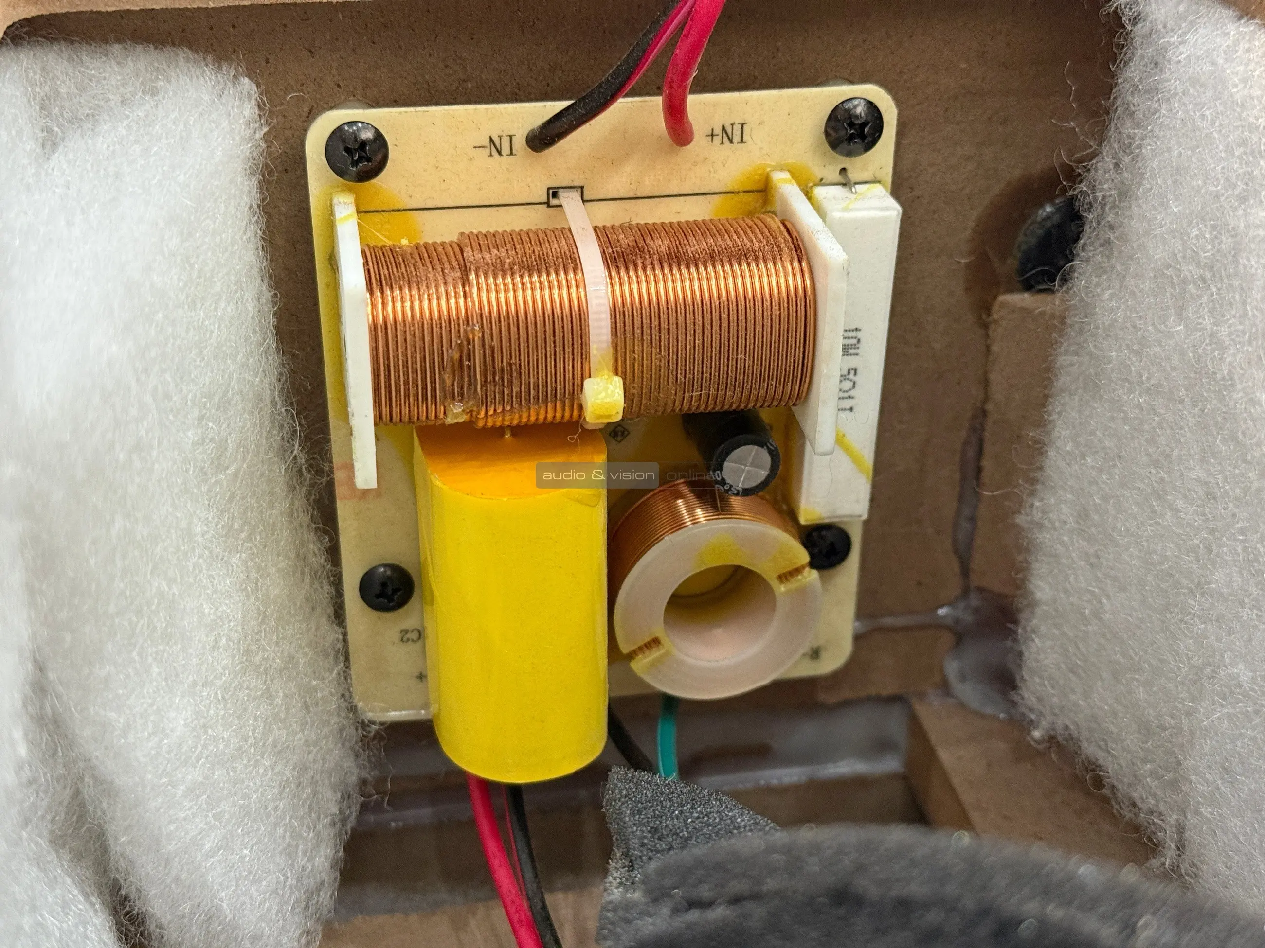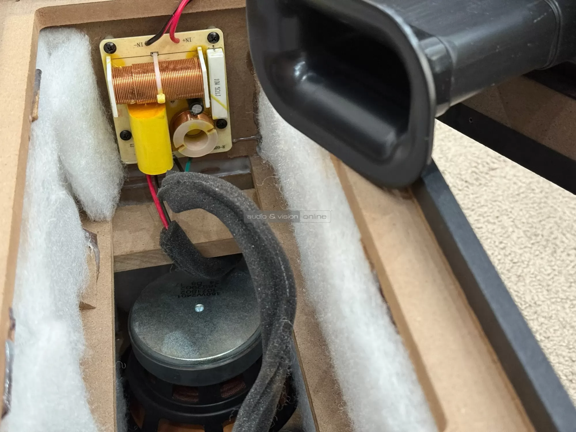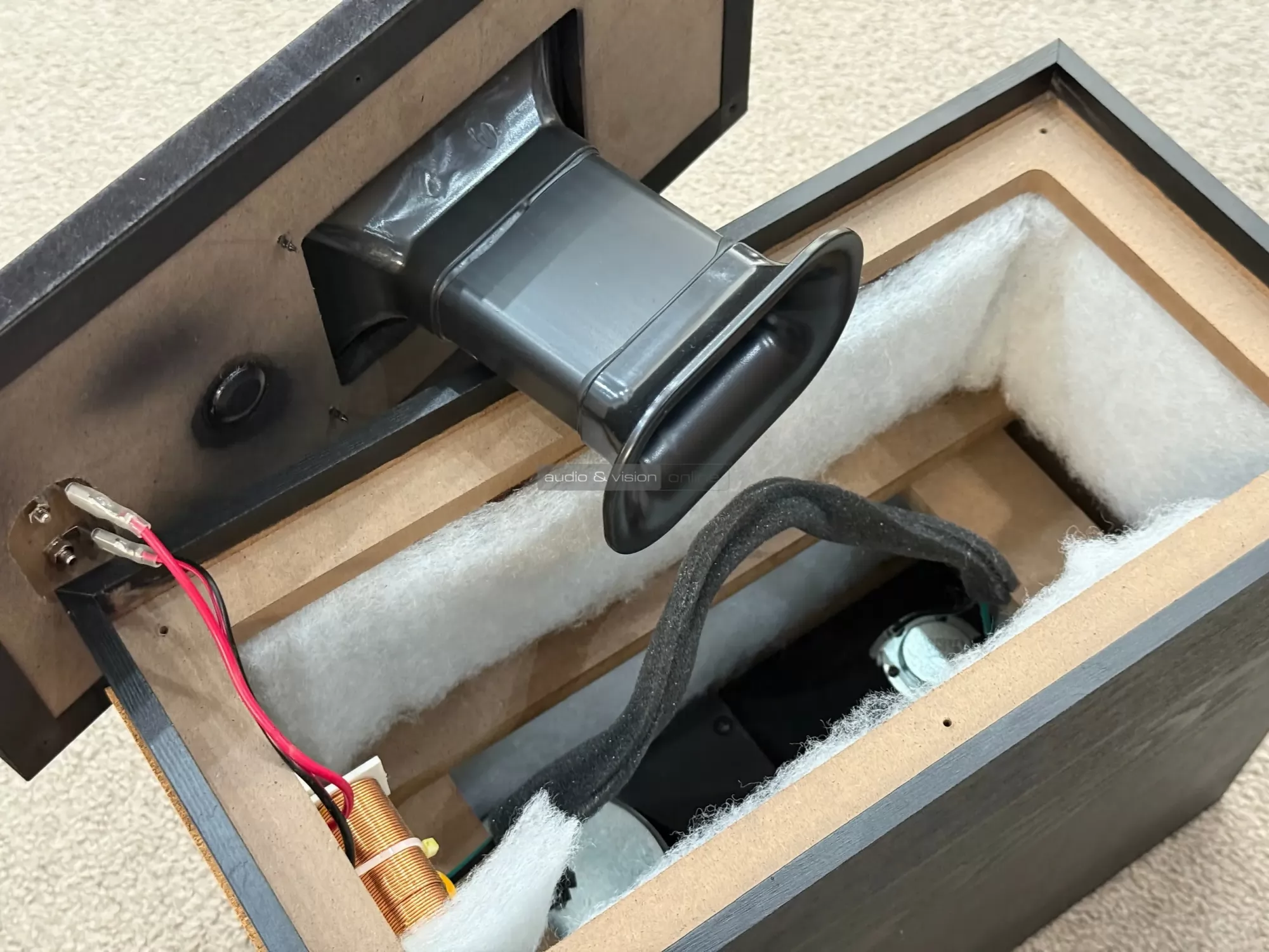 A 90° x 90° Tractrix fantázianevű tölcsér ezesetben is teljes dobozszélességű és nagyon mély, ebbe ültették a 25 mm-es alumíniumból készült magassugárzót, Linear Travel Suspension (LTS) felfüggesztéssel ellátva. Az alatta lévő TCP mélyközépsugárzó 165 mm-es, rézbevonatot kapott, a membrán hőformázott, kristályos polimerből készült. Csavarokat sehol nem találtunk, a kivitelezés és megmunkálás is remek, és még az aljára is jutott fantázia, hiszen külön betétet használtak, ami a sérüléstől is megvédi.