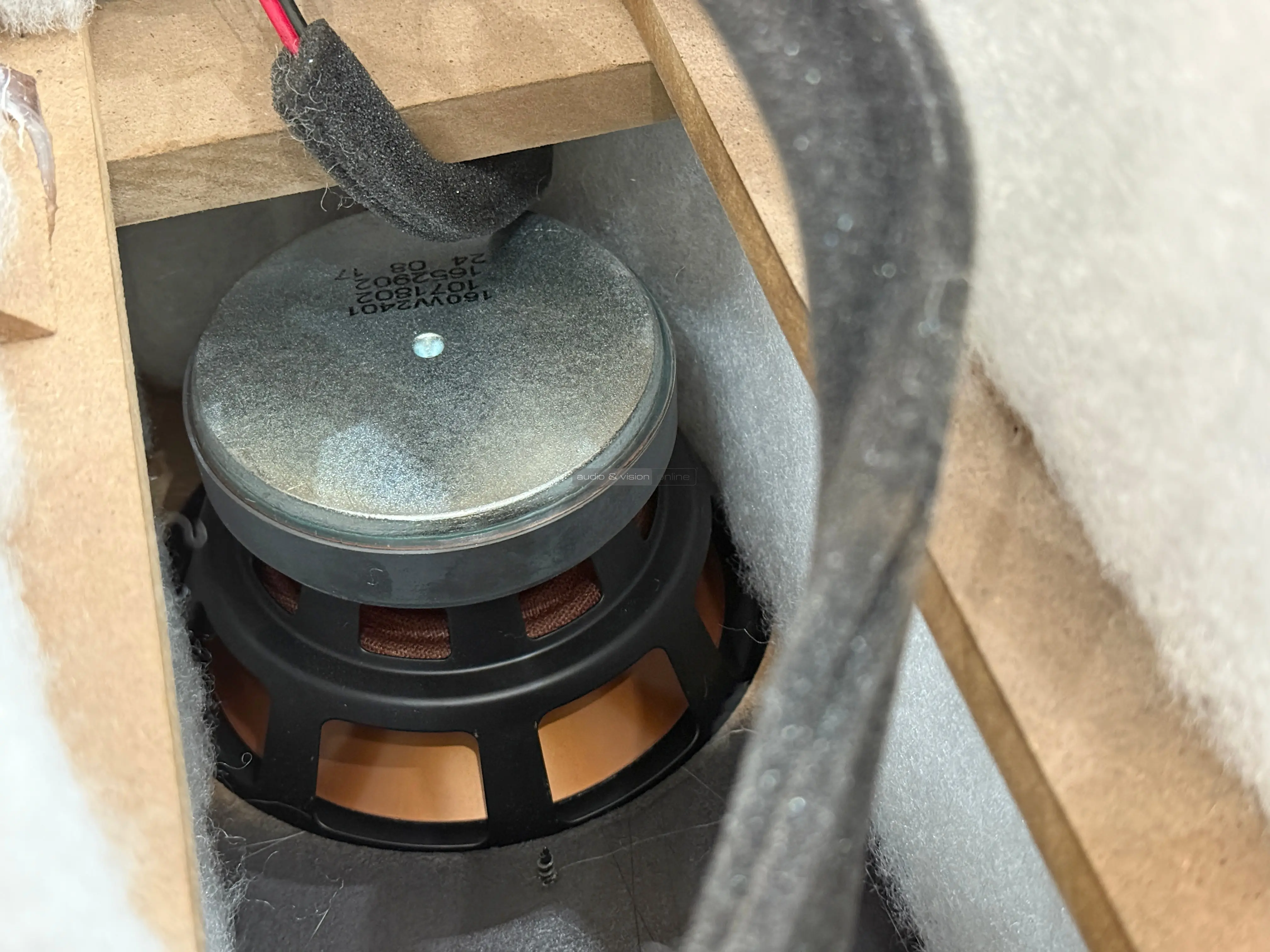 Elég vastag, 19 mm-es MDF-et használtak, nagy merevséget értek el vele, és rengeteg csillapítóanyaggal tömték tele. A színválasztékba biztosan nem fogunk belebonyolódni, hiszen egyedül fekete változatban vásárolható meg, viszont szintén kapott faerezetű és karcálló vinyl bevonatot, valamint mágnesesen rögzíthető védőszövetet, amin a gyártó logója is szerepel, az előlapon pedig középen mellette a sorozat elnevezése is.