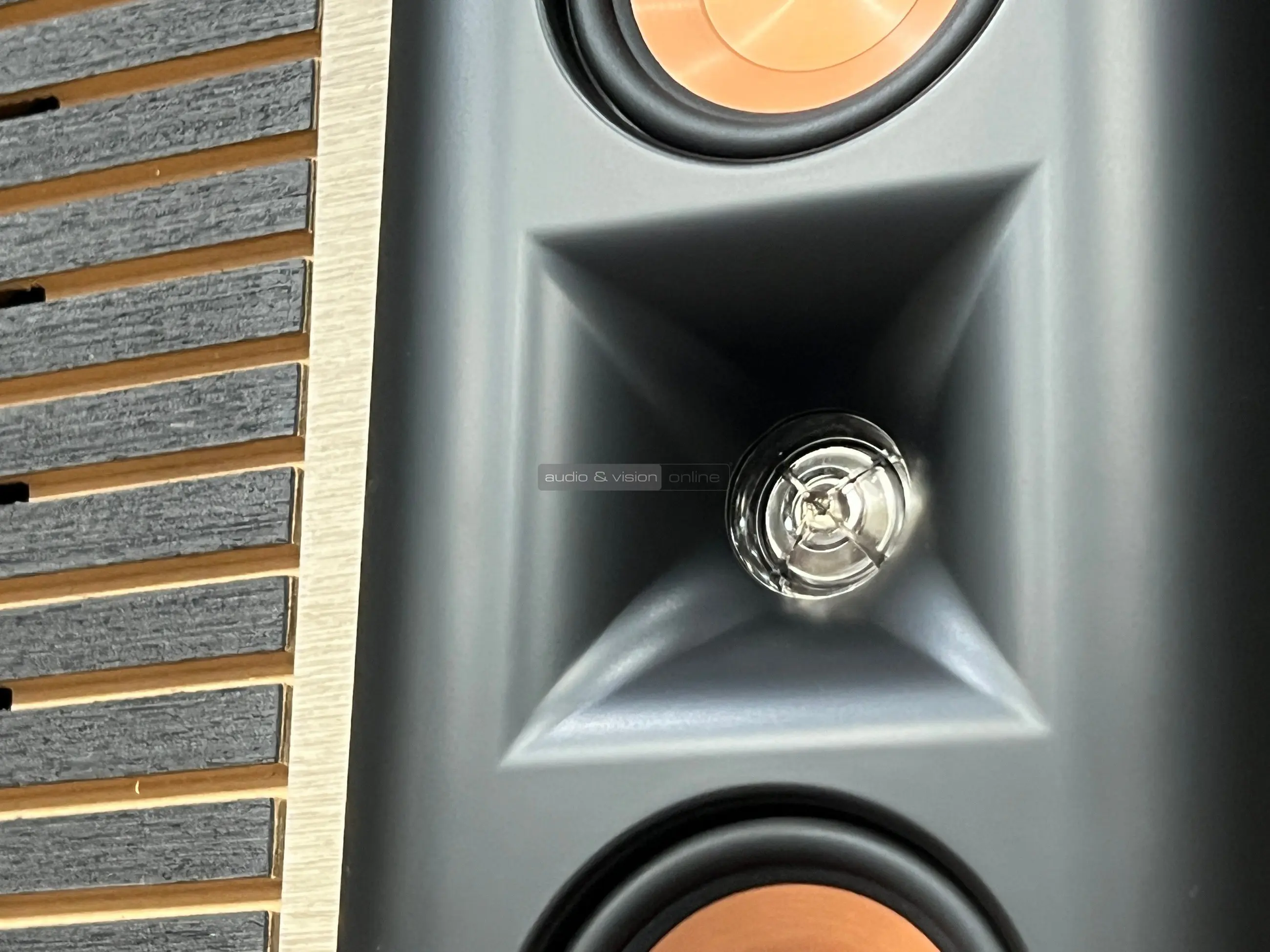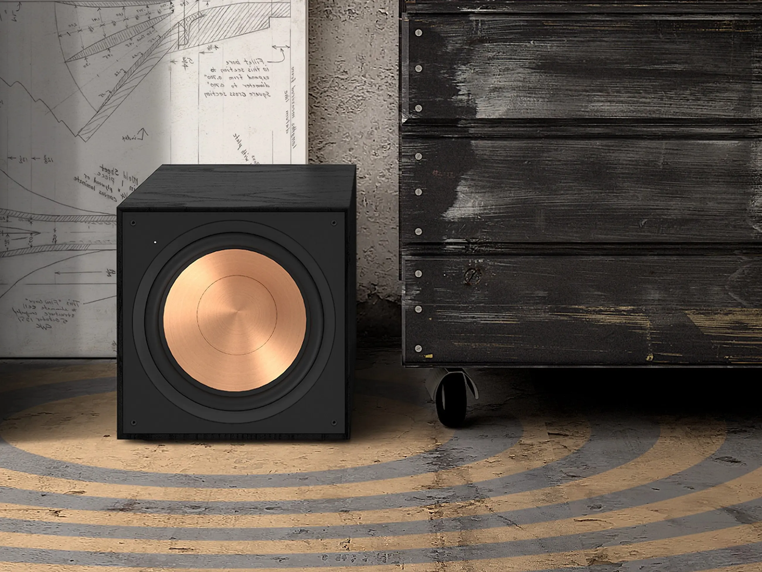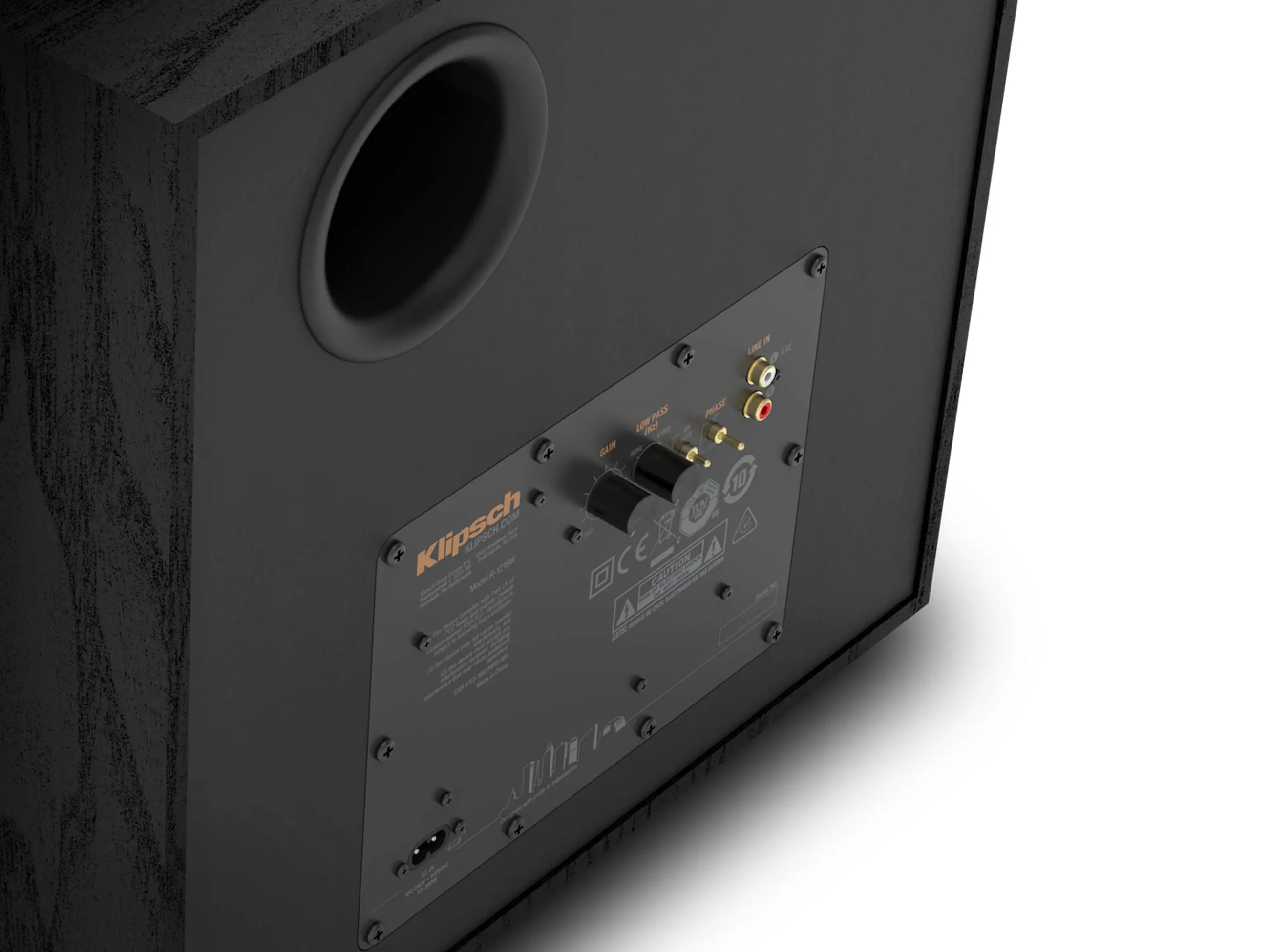 Az R-121SW aktív mélyládánál más a helyzet, hiszen itt már megerősített MDF-et alkalmaztak, a szín maradt fekete, de a bevonat karcálló, 305 mm-es rézbevonatú TCP mélysugárzó került a frontoldalra, hátra pedig, a bal felső sarokba egy reflexnyílás. Itt állíthatjuk a hangerőt, a frekvenciát, a fázist, van sztereó RCA bemenet, az áramhoz pedig borotvaaljzatú csatlakozó. A 16 kg-os láda 200 wattos digitális erősítőt rejt magában, amivel akár a 400 wattos csúcsteljesítmény is elérhető, persze csak átmenetileg. Az előlapon elhelyezett hangszóró egyértelműen direktebb hangot nyújt, viszont a hátsó basszreflex nyílás miatt az elhelyezéssel azért illik vigyázni, ha ezt meg is akarjuk kapni. Semmi flanc nincs tehát itt sem, mondhatjuk azt, hogy az R-121SW egy elég kompakt, relatív hétköznapi mélyláda, főleg a Klipsch repertoárjában.