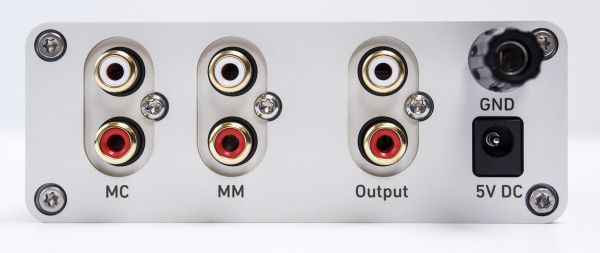 A készüléket megfordítva egy-egy MC és MM sztereó RCA bemenetet, valamint szintén RCA kimenetet látunk. Utóbbi mellett helyezkedik el a földelés csatlakozó, valamint a hálózati adapter bemenete is, aminek zajszintje 10 µV alatti, így egy lineáris tápegységhez képest nem okozhat érezhető minőségromlást.