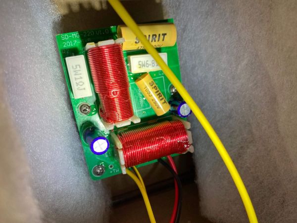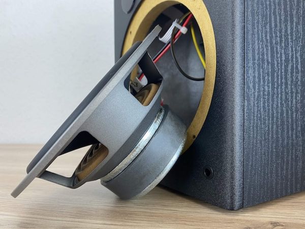 A jobb oldali, aktív egység hátlapján kb. 12x12 cm-es panelba ágyazva látható az összes korábban említett bemenet. Értékeltük, hogy a tápkábelt nem építették be gyárilag, hanem az igényesebb 3-tűs, IEC C-13 tápaljzatot alkalmazták. Ugyancsak pozitívum, hogy nem a legolcsóbb, rugós/csiptetős hangfal kábel aljzat segíti a bal oldali, passzív egység csatlakoztatását, hanem egy masszívabb, banándugó kompatibilis. A hátoldalra, a reflexnyílás alá került egy impulzus potméter is, amellyel a hangerőt lehet vezérelni.