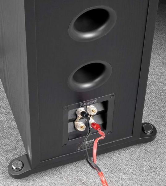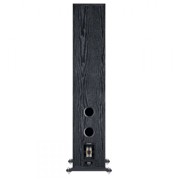 Hátul Airflex fantázianevű dupla reflexnyílást találunk egymás alatt, a csövek elég mélynek tűnnek, peremei pedig lekerekítettek. Lejjebb a dupla kábelezésre is alkalmas, teflon szigetelésű csatlakozók foglalnak helyet, a szokásos piros és fekete színt is megtaláljuk ugyan a belső részen, de szemből meg kell elégednünk a megkülönböztetéshez a + és - jelekkel. Problémát nem okoz, hiszen jó esetben csak egyszer kell bedugnunk a kábeleket.