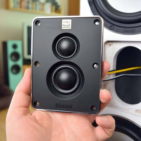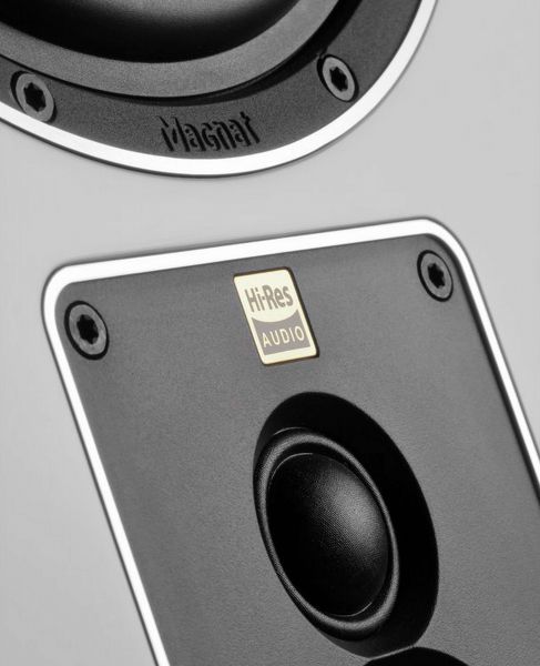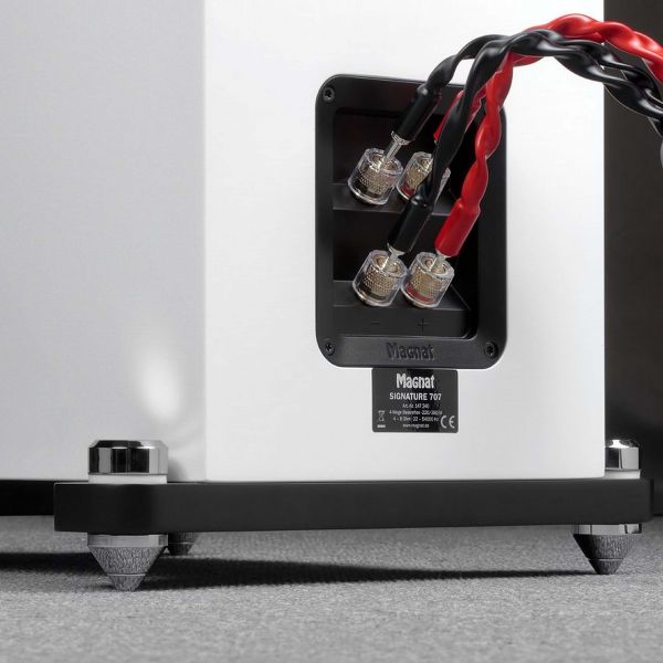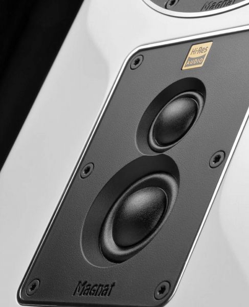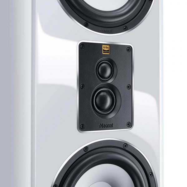 Az új fejlesztésű fmax magassugárzók ezek között találhatók egy keretben, ahogyan azt már a többi Signature esetében is láthattuk. A hagyományos 30 mm-es dóm alulra került, felette helyezkedik el a 20 mm-es magassugárzó, így ez a modell is megfelel a Hi-Res szabványnak, a hozzá tartozó matrica használata most sem maradt el. Ahogyan a neodímium mágnes sem, aminek ezúttal is a térhatásban van szerepe, valamint abban, hogy alacsony frekvencián csatlakozzanak a középtartományhoz. Mindegyik hangszórót króm keret díszíti, valamint a közép és mély membránok kaptak még fehér színt, egyéb flancról ezúttal is le kell mondanunk, és ez a Magnat szerint így van rendjén.