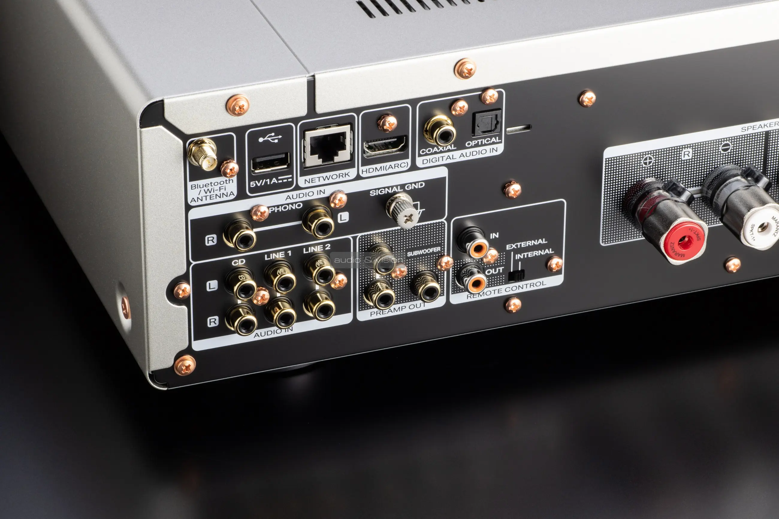 A hátlap jobb félteke nem rejt sok újdonságot, hiszen a minőségi hangfalkimeneteket és a cserélhető tápkábel aljzatát láthatjuk, továbbá egy Bluetooth antennát, azonban bal oldalon már egyből feltűnik néhány újdonság a megszokott vonalszintű és földeléssel ellátott phono bemenet mellett.