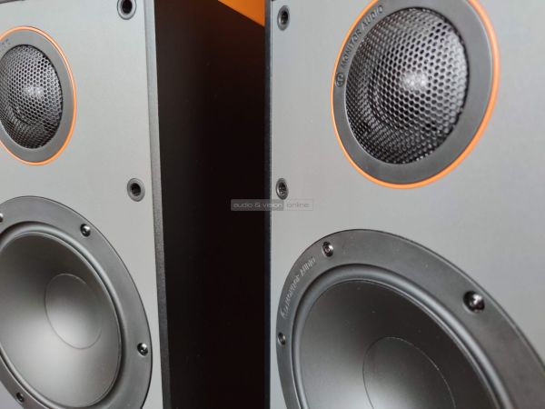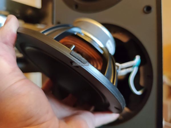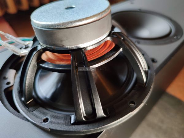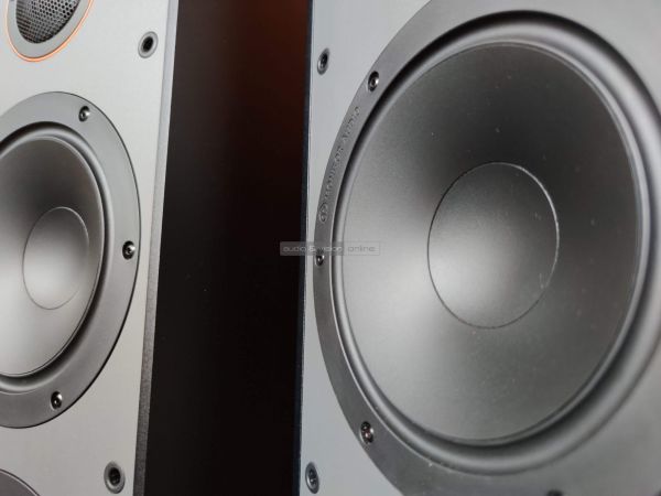 A korábbi Monitor sorozatnál a membrán színe narancssárga volt, ami nem idegen a gyártótól, hiszen már a kilencvenes években is találkoztunk ezzel a megoldással, ráadásul az emblémájuk háttereként továbbra is ezt használják. Picit talán hivalkodónak tartották, ezért gyorsan váltottak is, így most maradt a klasszikus fekete kivitel, a sárga csak a magassugárzó dekor peremén köszön vissza. Ez a 25 mm-es hangszóró C-CAM, tehát kerámia bevonatú, és alumínium-magnézium ötvözetű, és egyenesen a cég magasabb, Bronze szériájából került átemelésre. Elé sűrű és fix védőrács került, ami szerencsére olyan kivitelezésű, hogy a hangok útját nem szegélyezi vagy torzítja.