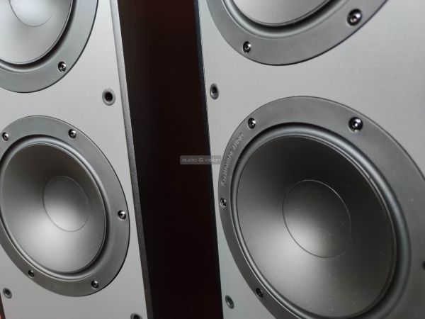 Alá pontosan három darab 165 mm-es hangszórót helyeztek, amiből a felső a középtartományért, az alsó kettő pedig a basszusért felel. Mindegyikük MMP II (Metal Matrix Polymer) technológiájú, középkategóriás típusok, és elvileg biztosítják a tiszta hangzás mellett a megfelelő mennyiségű és pontos mélytartományt is. Mint a korábbi típusnál, itt is mellékelnek a reflexnyílásba behelyezhető szivacsot, amivel elvileg további finomítást eszközölhetünk, ha azt a lakókörnyezet vagy az ízlésünk megkívánja. A fekete, fehér vagy dió színben megvásárolható modell hangszóróit hétköznapi kivitelű, és hagyományos módon és sok ponton rögzíthető szövet védi, ami természetesen eltávolítható. A kivitelezés a kategóriájában abszolút helytáll, nem találtunk illesztési vagy kivitelezési hibákat, és még a felszerelhető talpak, valamint a hozzájuk tartozó, lekerekített végű csavarok is megfelelő minőségűek, és kellő stabilitást nyújtanak a bő 13 kg-os hangdobozoknak, valamint a felmerülő káros rezonanciák elvezetésében is fontos szerepük van.