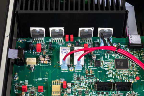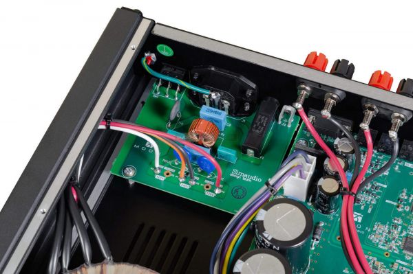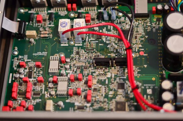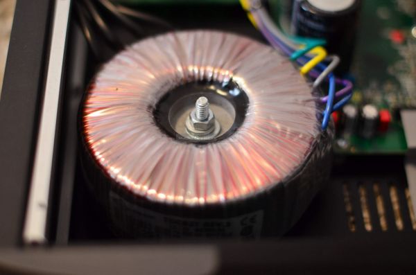 A vaskos, jó szellőzést biztosító motorháztetőt eltávolítva, minőségi alkatrészekből felépülő és jól átgondolt áramköri elrendezést láthattunk egy szépen megtermett toroid trafó környezetében. Az AB osztályban működő erősítő 2x50 W teljesítményt szorít ki magából, ami talán nem egy erőmű, de egy magas érzékenységű hangfallal csodákra képes.