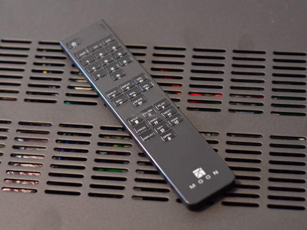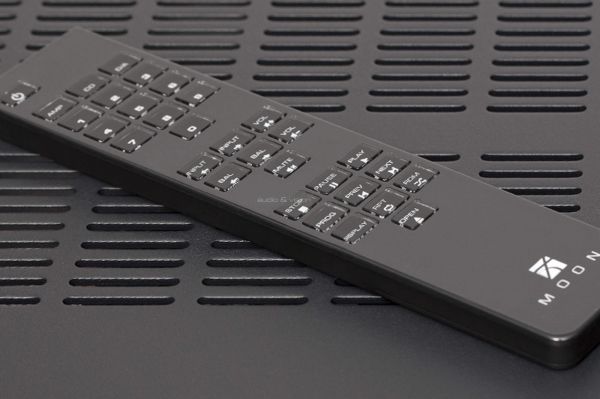Szemből nézve akadt egy kis Mark Levinson utánérzésünk, de mégis tökéletesen megőrizte a Moon-os (vagy Simaudio-s) jellegzetességeket. Az anyagok minőségén nagyon jól látszik, hogy nem pár százezres szerkezet került a kezünkbe. Az előlap egy vaskos szálcsiszolt alumínium tömb, bár a széleken lévő ívelt elemeket feláldozták a költségcsökkentés oltárán és műanyagból készültek, pár másodpercig fogdosnunk, simogatnunk kellett mire ebben biztosak lettünk. Az előlapi OLED kijelző karakterei jó minőségben és jól láthatóan jelennek meg, körülötte pedig a fontosabb kezelőgombok helyezkednek el. Ízlés kérdése, de szerintünk nem feltétlenül áll jól e gomboknak az ezüst szín, a fekete talán jobban mutatna itt.