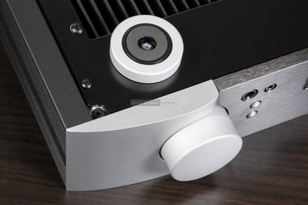 Az előlapon találunk még egy 6,3 mm-es fejhallgató Jack kimenetet, egy AUX aljzatot, valamint egy nagyon finom mozgású hangerőszabályzó tárcsát. Az erősítő oldalait szintén masszív alumínium hűtőbordák képezik, és a Moon 240i felső burkolata is példás vastagságnak és stabilitásnak örvend. Itt nyoma sincs a más gyártóknál többször tapasztalt rezgő lemez fedélnek.
