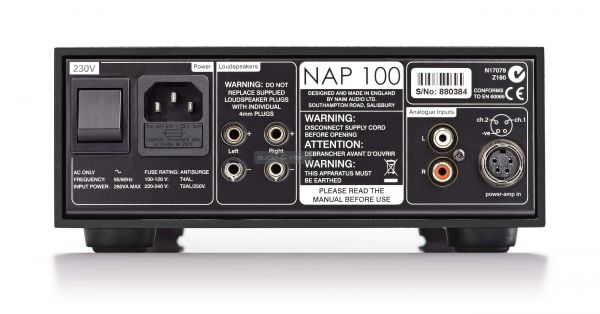 A hátlapon csak a legszükségesebb ki- és bemenetek kaptak helyet, melyek kimerülnek az IEC tápkábel aljzatában, az angolosan, csak banándugós kábelezésre alkalmas hangfalkábel csatlakozókban (a gyári Naim dupla csatlakozón felül), valamint az analóg RCA és DIN kábelaljzatban. Az üzembehelyezésért felelős billenő főkapcsoló is itt kapott helyet, tehát szokásos módon a NAP 100-at sem tudjuk távvezérlőről készenlétbe helyezni.