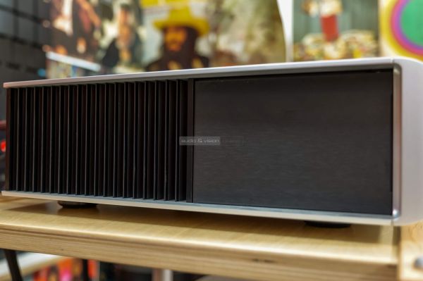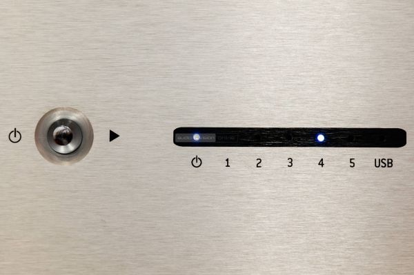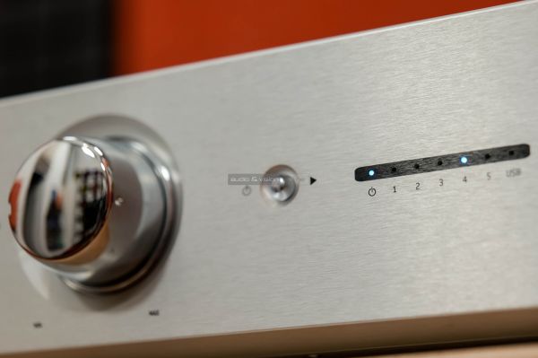 Az előlap letisztultságát mi sem mutatja jobban, mint hogy azon a középre pozícionált hangerő gombon kívül csak az annak bal oldalán lévő infra érzékelő, illetve a jobb oldalán található bekapcsoló gomb foglal helyet, amelyet csak egy ízléses LED sor egészít ki, ez jelzi vissza az erősítő státuszát, illetve az aktív bemenetet.