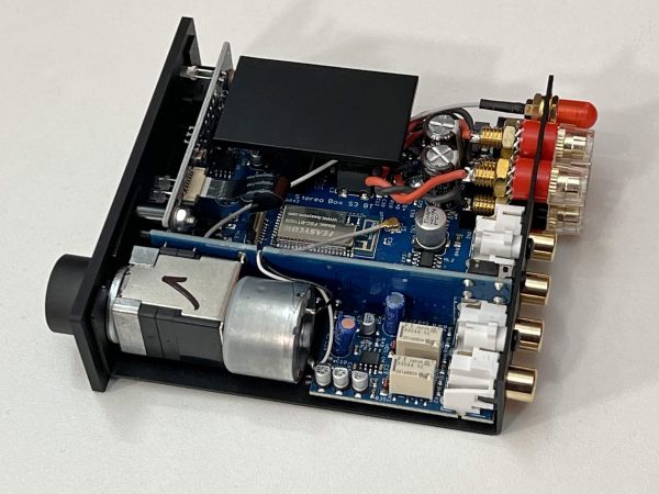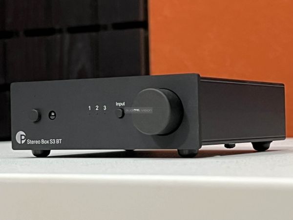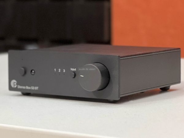 A Stereo Box S3 BT sztereó erősítőt a cég elsősorban kis helyiségekbe szánja, és állványos hangfalakhoz, amelyeket akár polcra vagy íróasztalra is elhelyezhetünk, méretének köszönhetően pedig valóban nagyon pici a helyigénye. A teljes alumíniumburkolat véd a rezgések és a nem kívánt interferencia ellen is, az esetleg fellépő rezonanciákat négy apró láb vezeti el. Az előlap letisztult, egyszerű, amolyan igazi "projectes". Baloldalon üzembehelyező gomb, mellette az infra jelet fogadó érzékelő, majd három apró LED van, amelyek a bemeneteket jelzik, a váltás ezek mellett egy gombbal történik, a hangerő állítása pedig egy motoros tárcsával. Más nem is kell, csak egy távirányító, ami szintin kicsi, de egyértelműen használható darab, innen elérhető a teljesen analóg hangerőszabályozás, és a bemenetválasztás is.