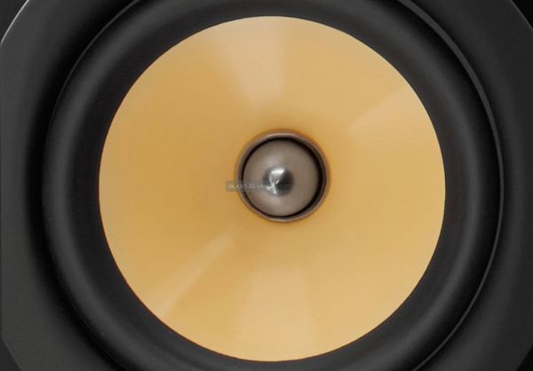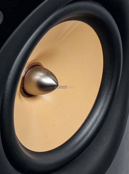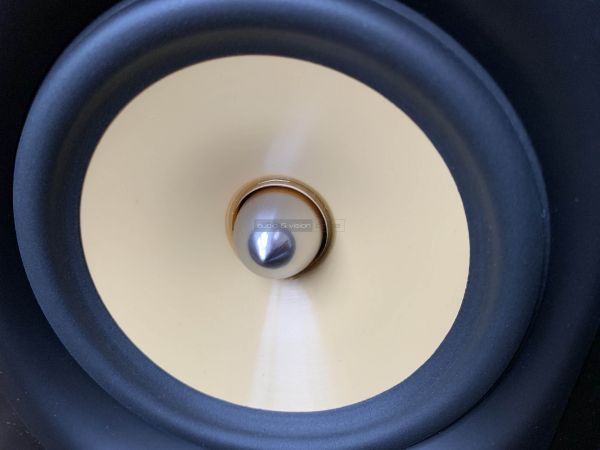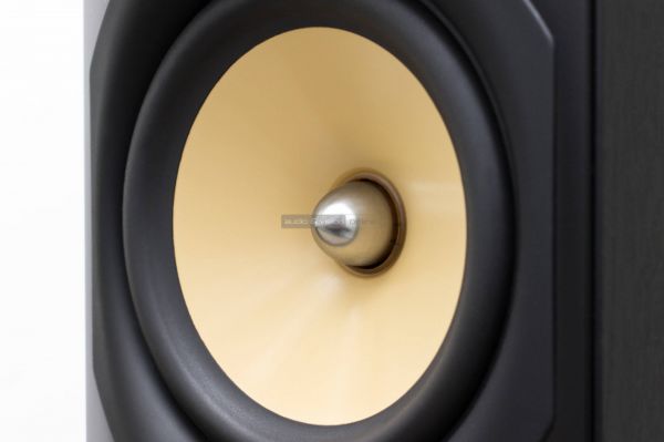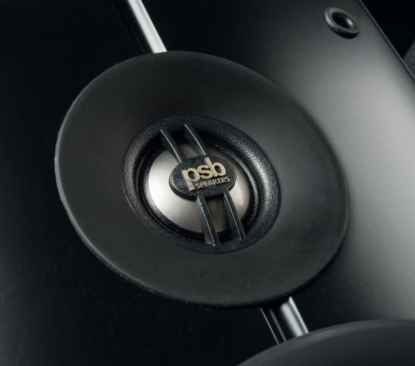 Fölötte helyezkedik el a 25 mm-es, neodímium mágneses, ferrofluid hűtésű titán dóm magassugárzó, előle pedig nem hiányzik most sem a cég emblémája kis keretben, ami a hang terjedését ezúttal is pozitívan befolyásolja. A hangszórókat műanyagba integrálták a stabilitás érdekében, a hangsugárzó többi része pedig a már említett MDF. A PSB úgy látszik, nem szereti a csavarokat, a ragasztót viszont annál inkább. Nekik bevált, minket pedig nem zavar, hogy nem töri meg semmi az előlapi síkot, csupán a középső függőleges vájat.