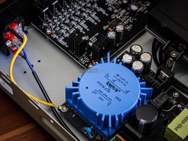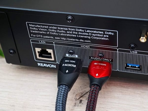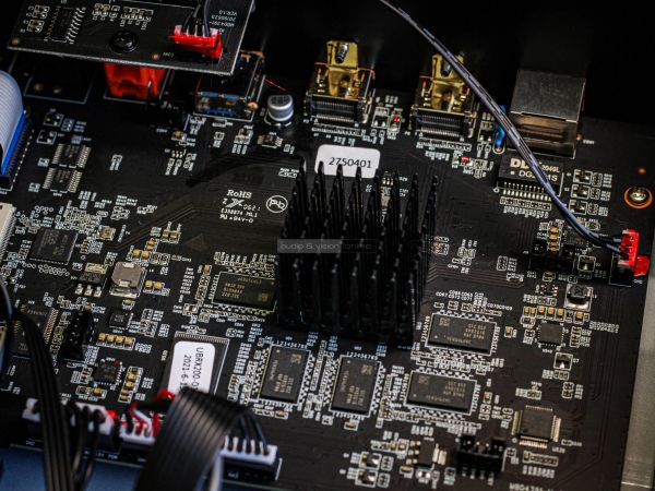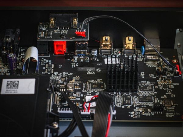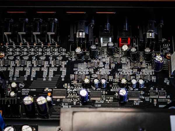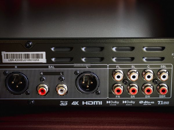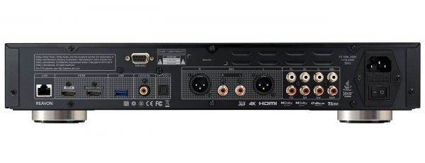 A hátsó oldal csatlakozók népes táborát tartalmazza. Adott egy RJ-45 Ethernet port, két HDMI, egy második USB-A (3.0) bemenet, továbbá egy optikai és egy koaxiális digitális kimenet. Ahogy fentebb is említettük, az analóg részen RCA és XLR csatlakozók közül is választhatnak azok, akik különálló DAC nélkül szeretnék sztereó rendszerükbe illeszteni az eszközt. Az IEC tápcsatlakozó alatt egy főkapcsoló is rendelkezésre áll, illetve a digitális bemenetek fölött RS-232 port nyújthat segítséget okosotthon integrátorok számára.