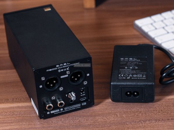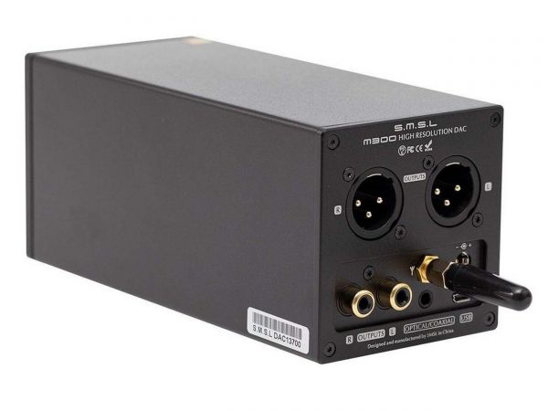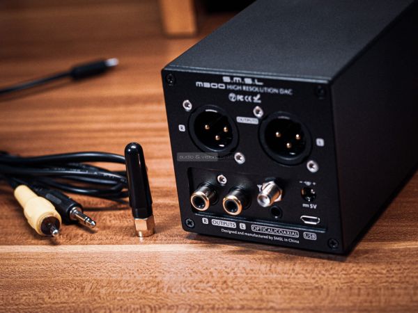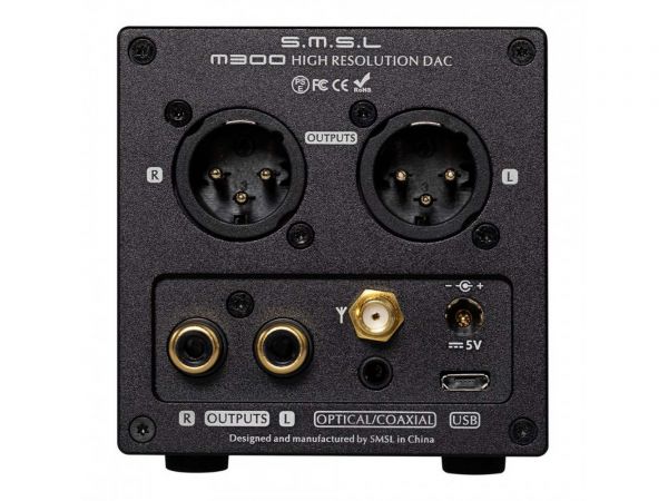 Megfordítva az S.M.S.L M300 MKII-t (vagy megkerülve a hifi állványt és mögé nézve) meglepődve konstatáljuk az XLR csatlakozókat, ezzel nem spóroltak a mérnökök. Van még természetesen normál RCA kijárat is, a külső tápegység bemeneti aljzata, a Bluetooth antenna menetes csatlakozó aljzata, egy kombinált optikai/koaxiális kimenet (az átalakító kábel mellékelve) és egy - némileg érthetetlen módon - micro USB bemeneti aljzat a megszokott USB-B helyett.