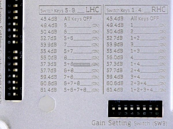 Ugyanígy jelszint kapcsolósort is kapunk előbbiek mellett, szintén mikrokapcsolókkal. Ezekkel 45,4 és 61,4 dB értékek között 12 lépésben állíthatjuk a kimeneti teljesítményt. Valamiért ezt a beállítást csatornánként tehetjük meg, így a kapcsolók 24 féle kombinációban állíthatók. Értelemszerűen ezek a jelentik a készülék legfőbb vezérlőegységeit, hiszen nekik köszönhetően érhetünk el tökéletes hangszedő illesztést valamint - szinte - ízlés szerinti hangerő-növelést.
