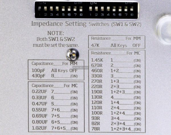 Az igazi érdekességeket azonban a készülék alján találjuk: itt állíthatjuk be a terhelő-impedanciát és terhelő-kapacitást, ezzel tökéletesen illesztve a PHONO-1-et MM vagy MC hangszedőinkhez.