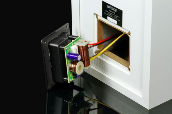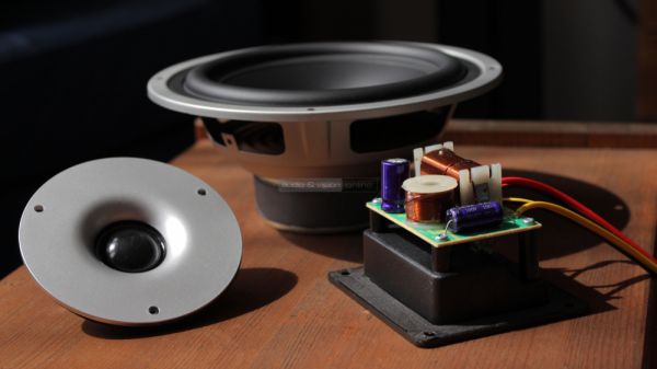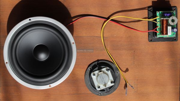 A csatlakozó túloldalára rögzített keresztváltó egyszerű, ugyanakkor rendezett, a szükségesnél nem hosszabb, sarus vezetékekkel. A magassugárzó pénzérme nagyságú mágnese elsőre viccesen kicsinek tűnhet. Neodímium fajtájú, vagyis parányiságát nagy erővel kompenzálja. A masszívabb mélyközép membrán kosarába bepillantva láthatóvá vált a kónusz hátsó felülete. Sűrű szövésű rosthálót láttunk rajta, tehát a préselt papír egy kis erősítést kapott. A doboz belsejének jobb- és baloldalát gyapotszerű anyag fedi, a basszreflex nyílás eleje és vége műanyag tölcsér, a középső csatorna pedig kartonból készült cső.