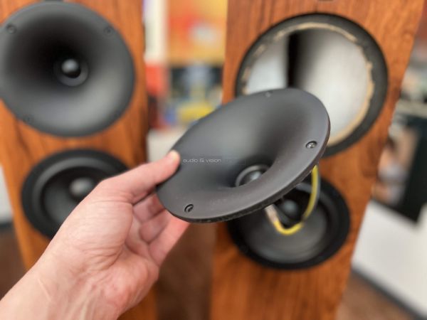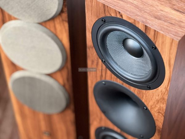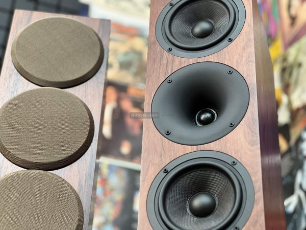 Kettőjük között foglal helyet a szintén 140 mm-es üvegszálas tölcsér, aminek a közepén pihen a 28 mm-es lágy dóm magassugárzó, így ennek a tartománynak az egyenletes elosztására is odafigyeltek, ahogyan a stabilitására is, hiszen itt is alkalmaztak egy nagyméretű neodímium mágnest.